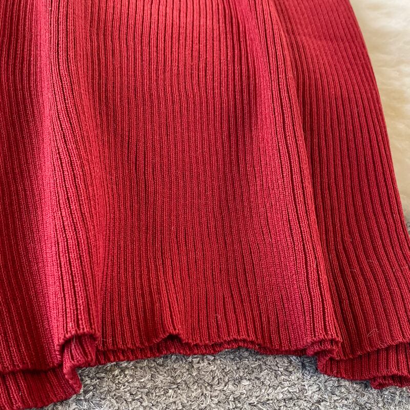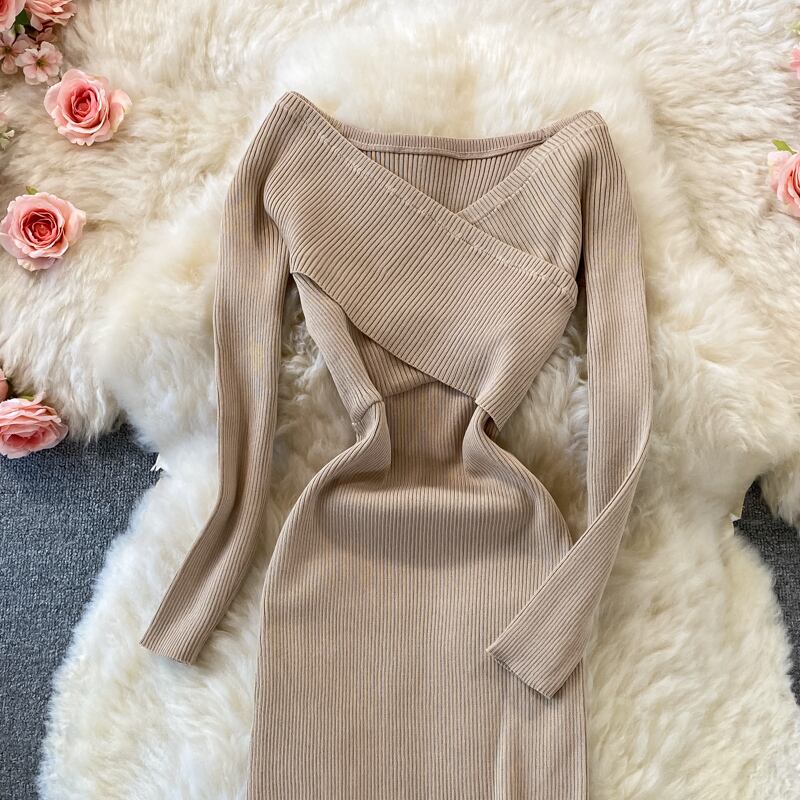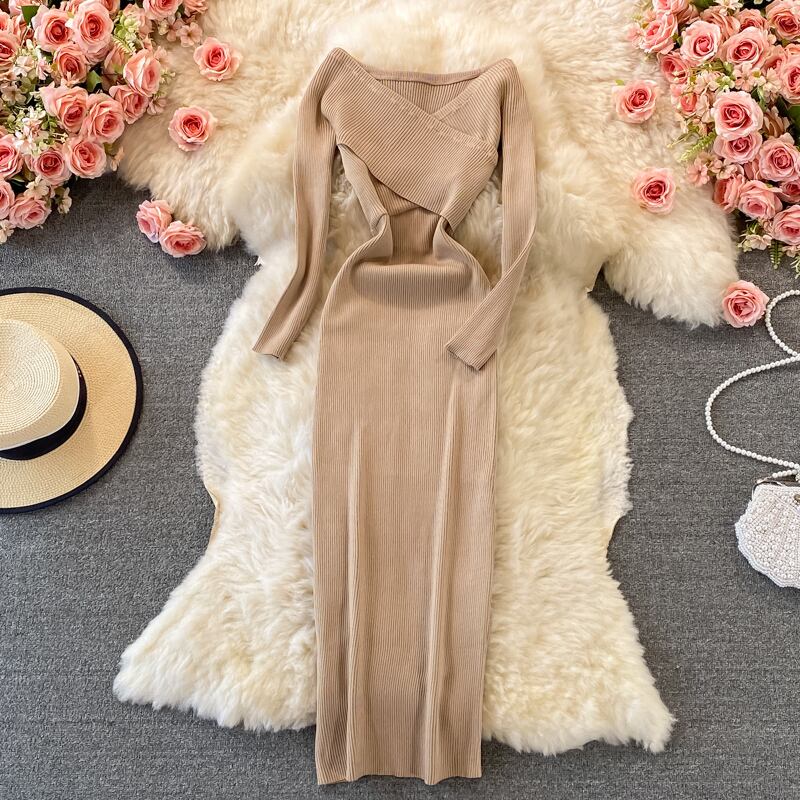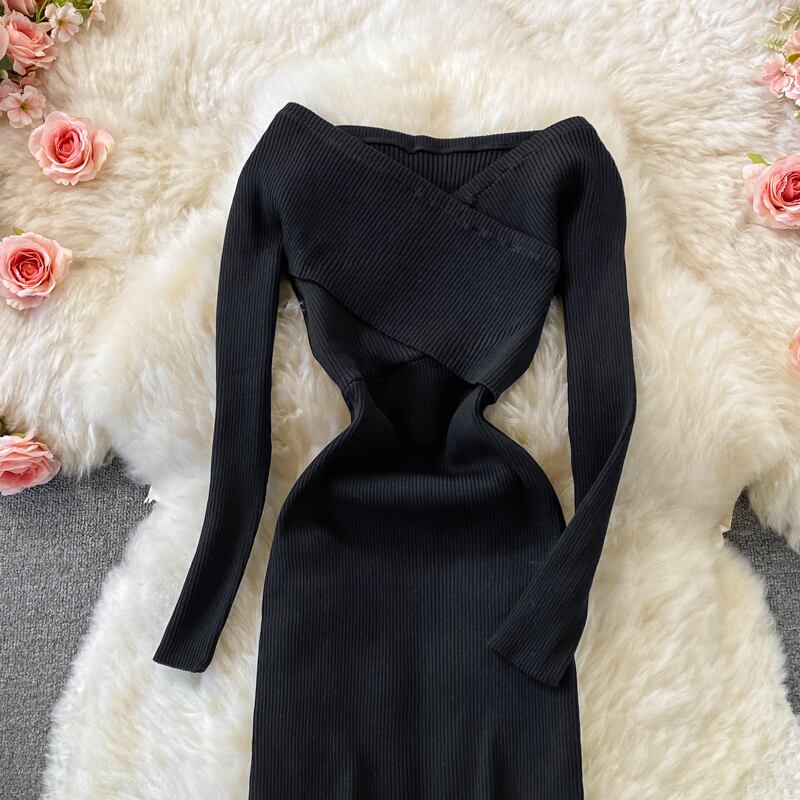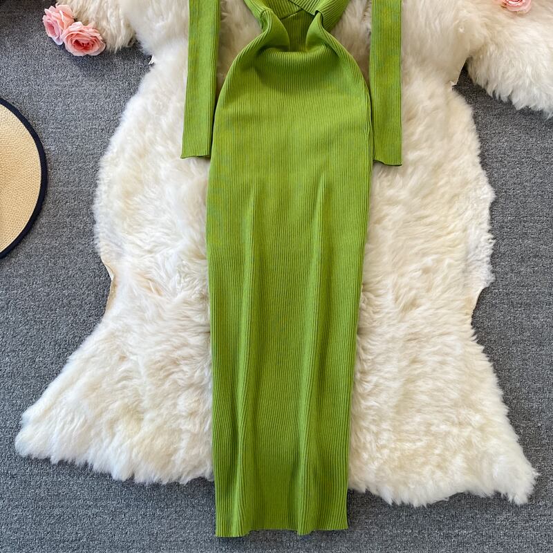 無地弾性フレンチレトロスリム長袖 V ヒップラップ赤ニットドレスウエストボディコン Vestidos ペンシルセータードレス ロング レッド エラスティック 伸縮 ソリッドカラー