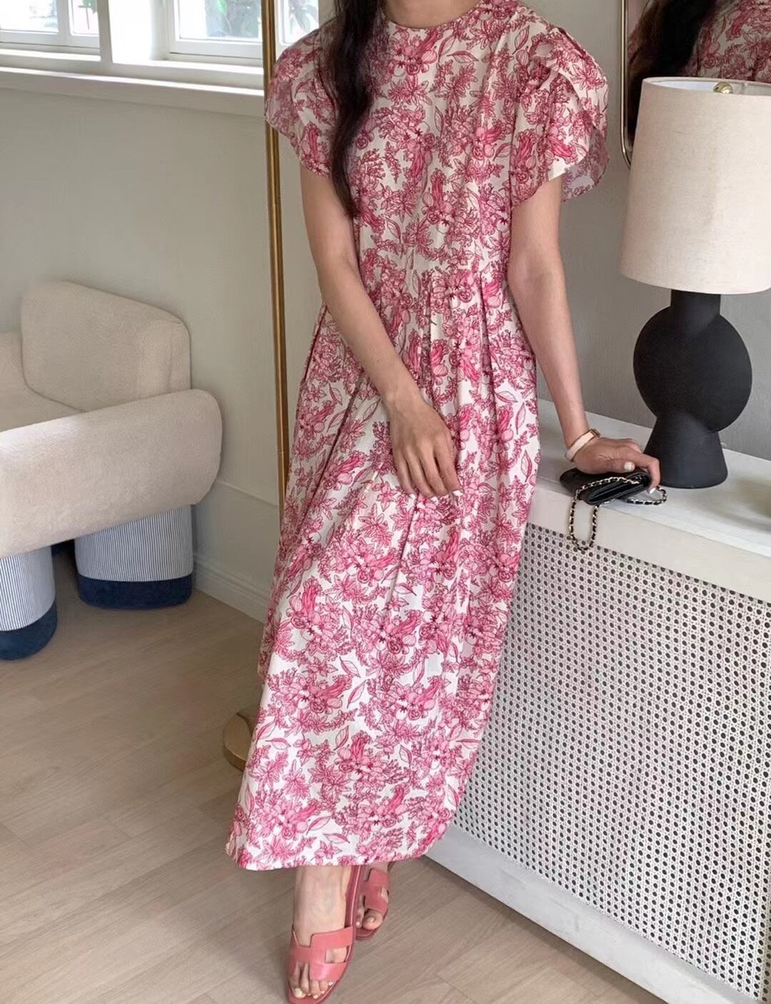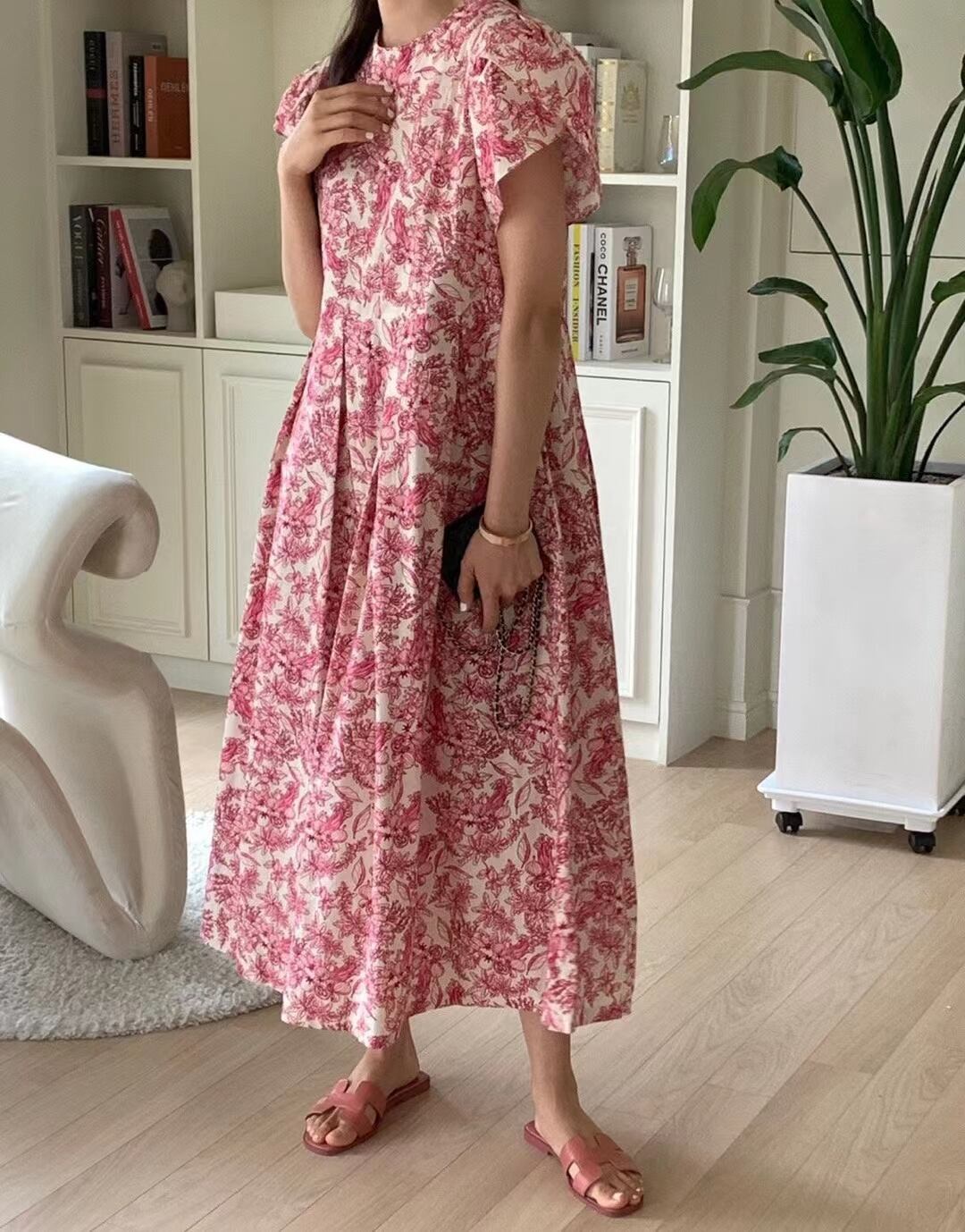 Vestidos O ネックプリーツウエストロングルーズブルーフライングスリーブインクプリントドレス夏花休日 サマー 夏物 花柄 Oネック