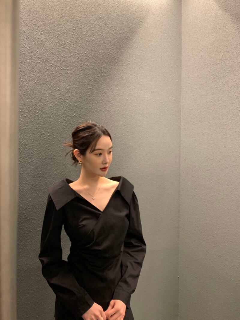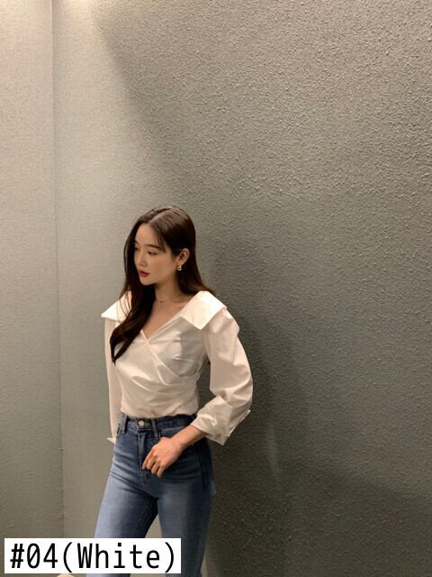 De Moda 春ラペル長袖白シャツブルー プリーツ トップ OL ルーズ ブラウス シャツ ロング ホワイト スプリング 春物