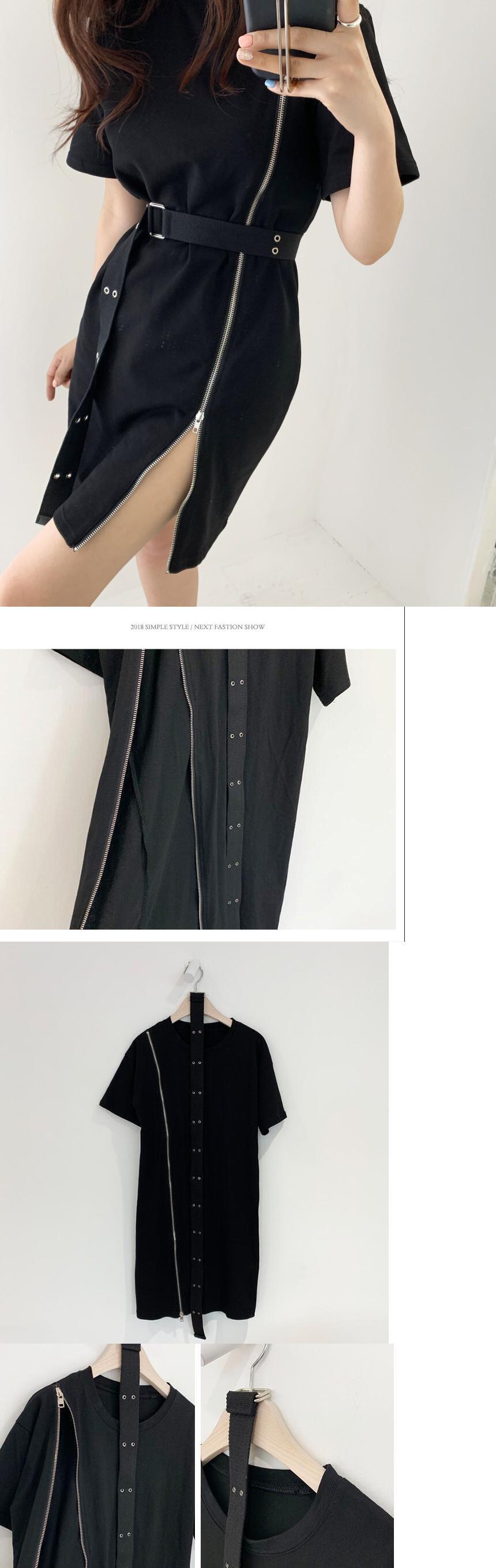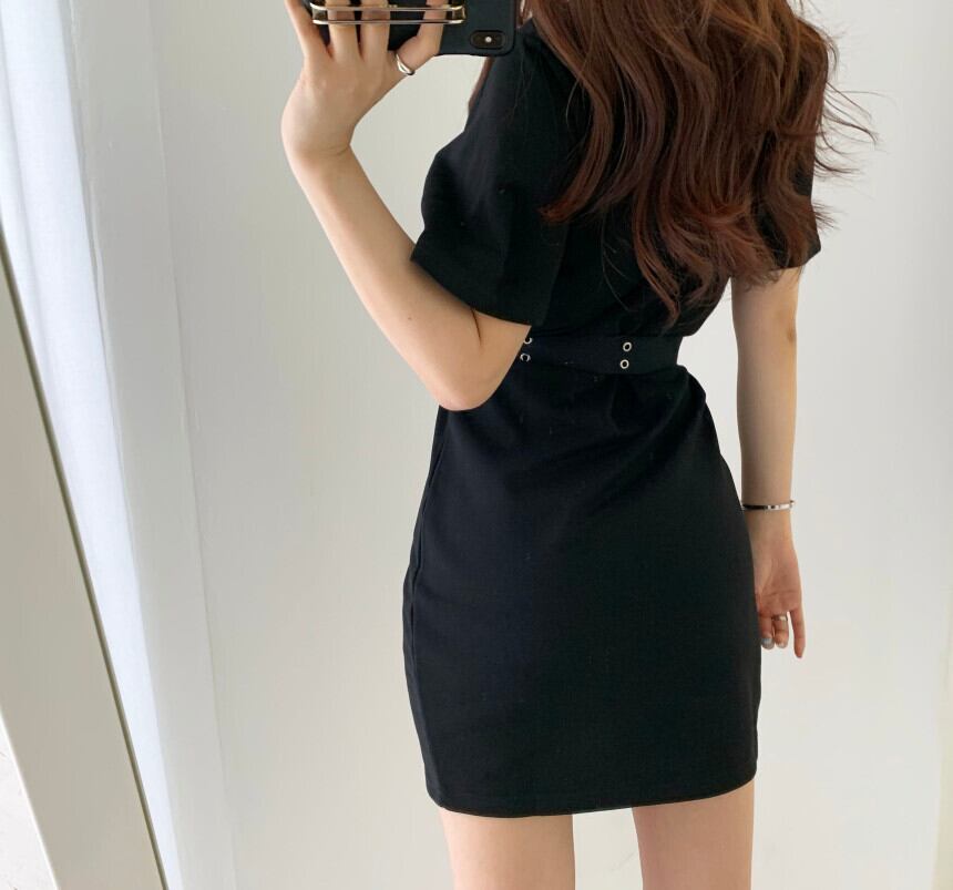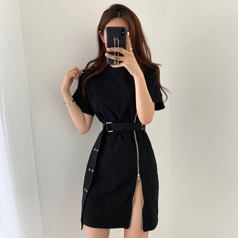 ストレートスリットクルージッパー黒 Tシャツドレスベルトウエストローブ夏 Vestidos ストリートゴス野生半袖 ショート ブラック ハーフスリーブ サマー 夏物 ハーネス