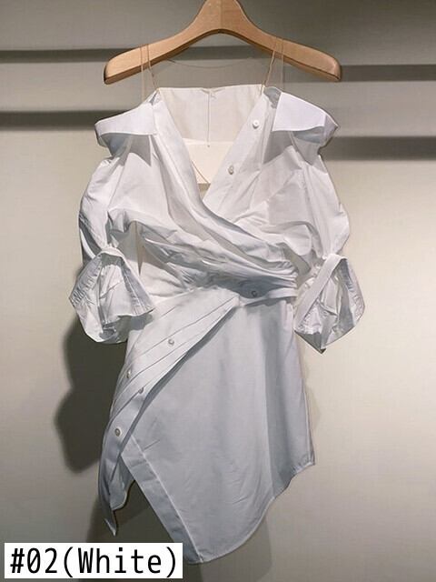 ブルーストライプウエストサスペンダー不規則な白いシャツドレスワイルド Vestidos es 春偽 2 ホワイト スプリング 春物