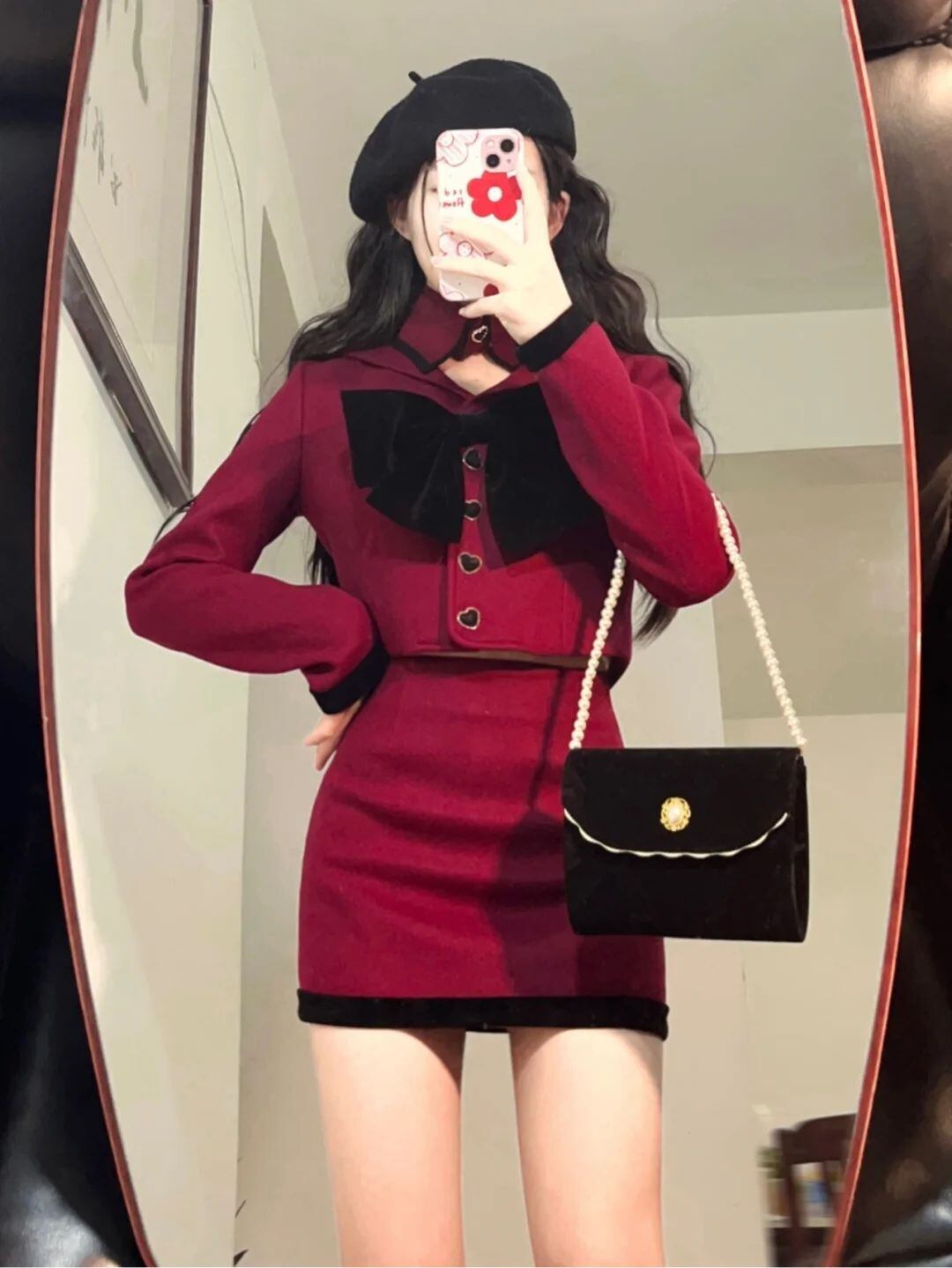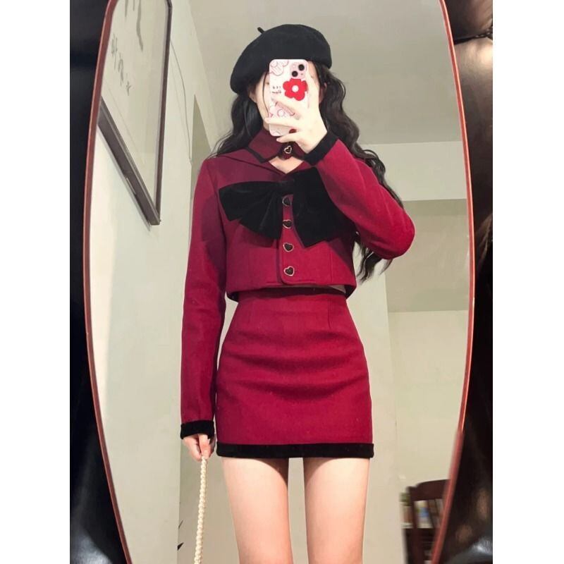 ツーピースセットレディース衣装中空愛ボタンシャツセクシーなラップヒップスカート秋の弓ブラウストップス リボン オータム 秋物