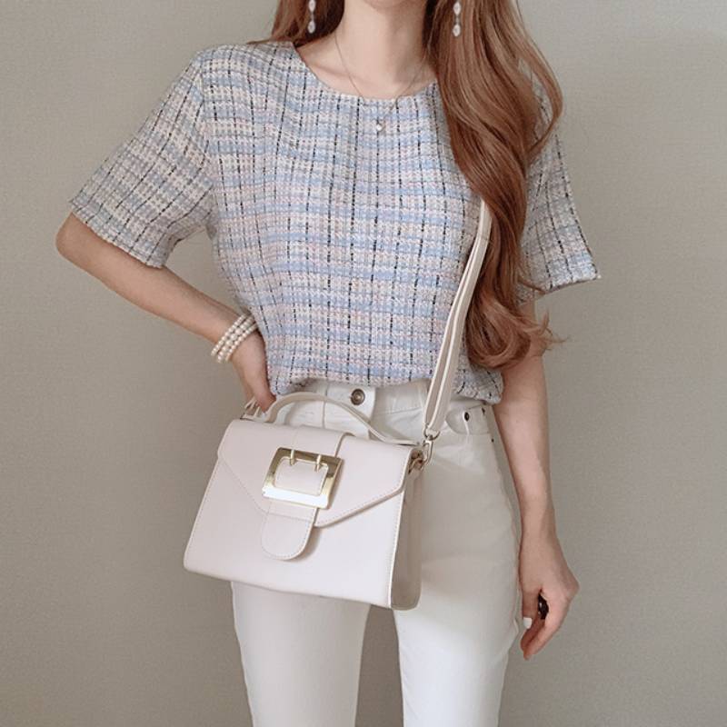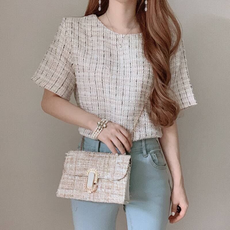 夏のレトロなルーズ O ネック半袖ツイード格子縞のシャツののトップス レディ ストライプ ブラウス ショート ハーフスリーブ サマー 夏物 Oネック