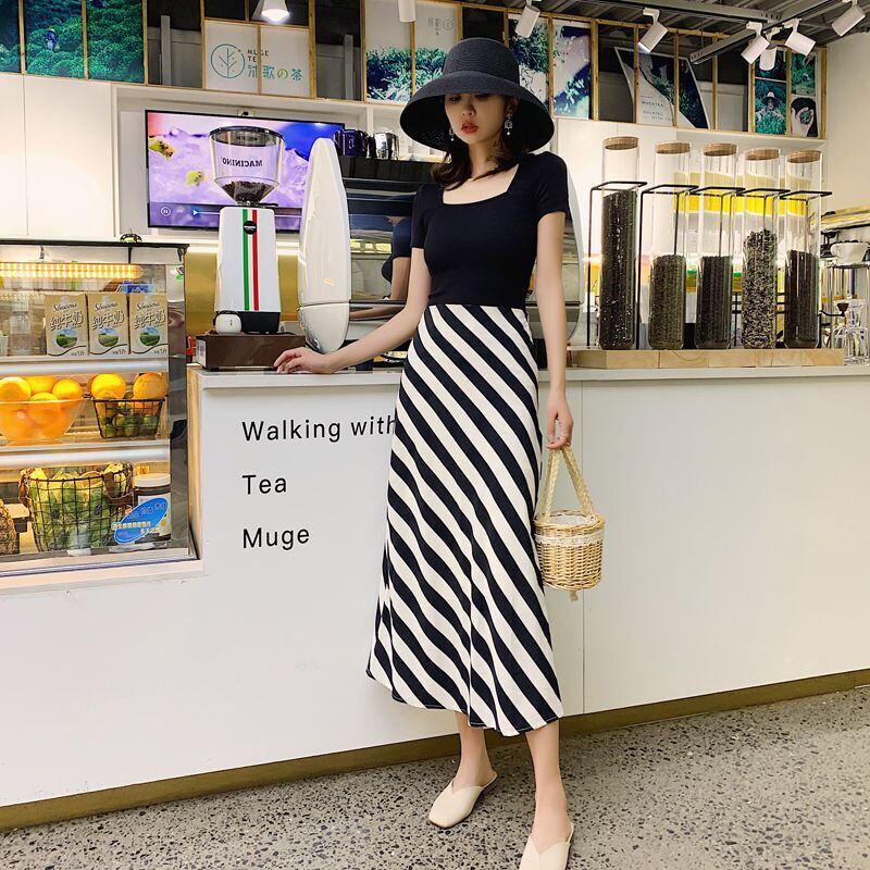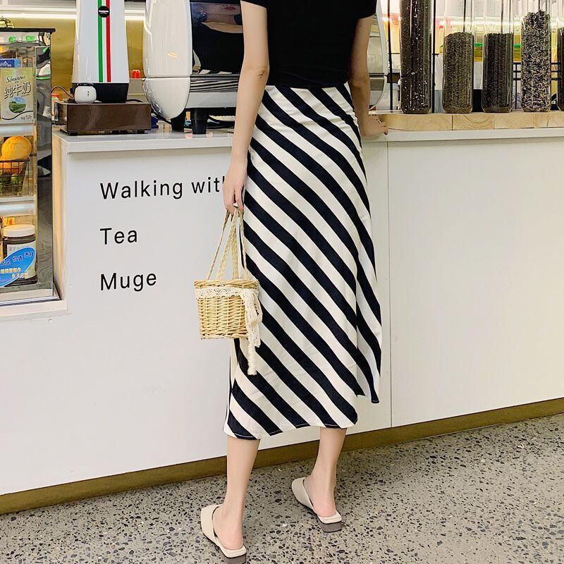 OLウエストブラックホワイトストライプスカートAラインミディロング春シフォンスカートファルダス スプリング 春物