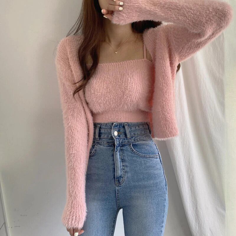 スウィート 2 ピースセットセクシーな防水ミンクピンククロップドカーディガン V 長袖セーターモヘアコート無地ベストキャミソールトップススリム ロング 大人ガーリー キュート カジュアル ソリッドカラー