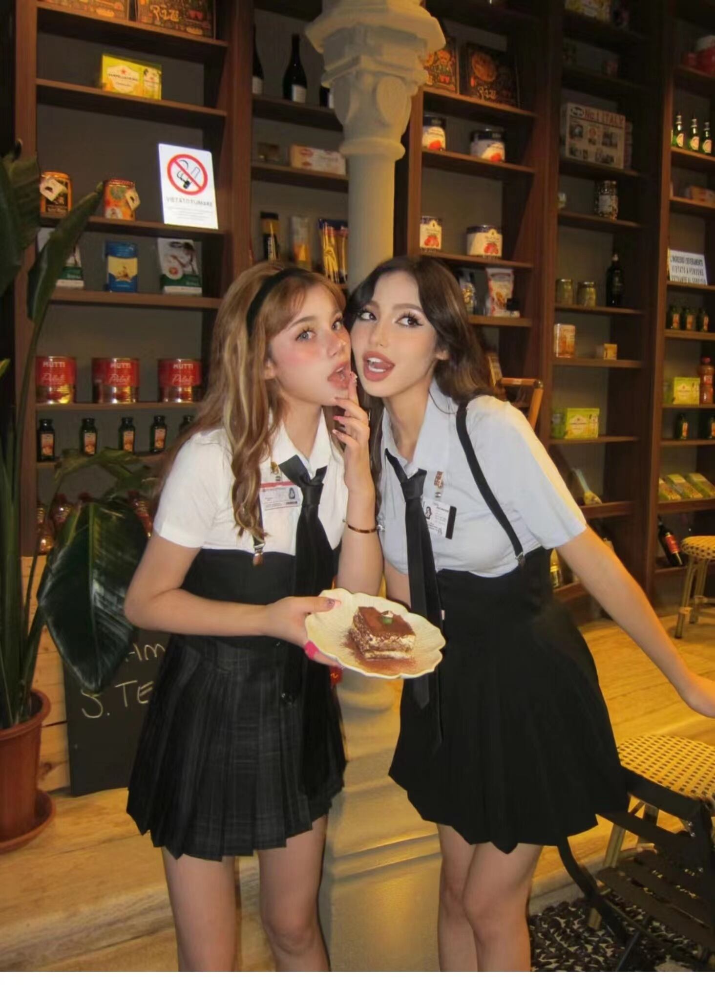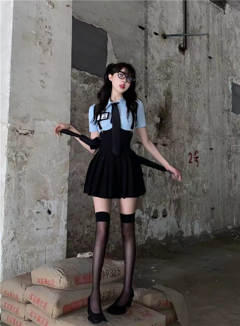 スカート セット レトロ ブルー シャツ ネクタイ ウエスト ブラック ストラップ ドレス スーツ ガール プレッピー スタイル 夏 Y2k サマー 夏物