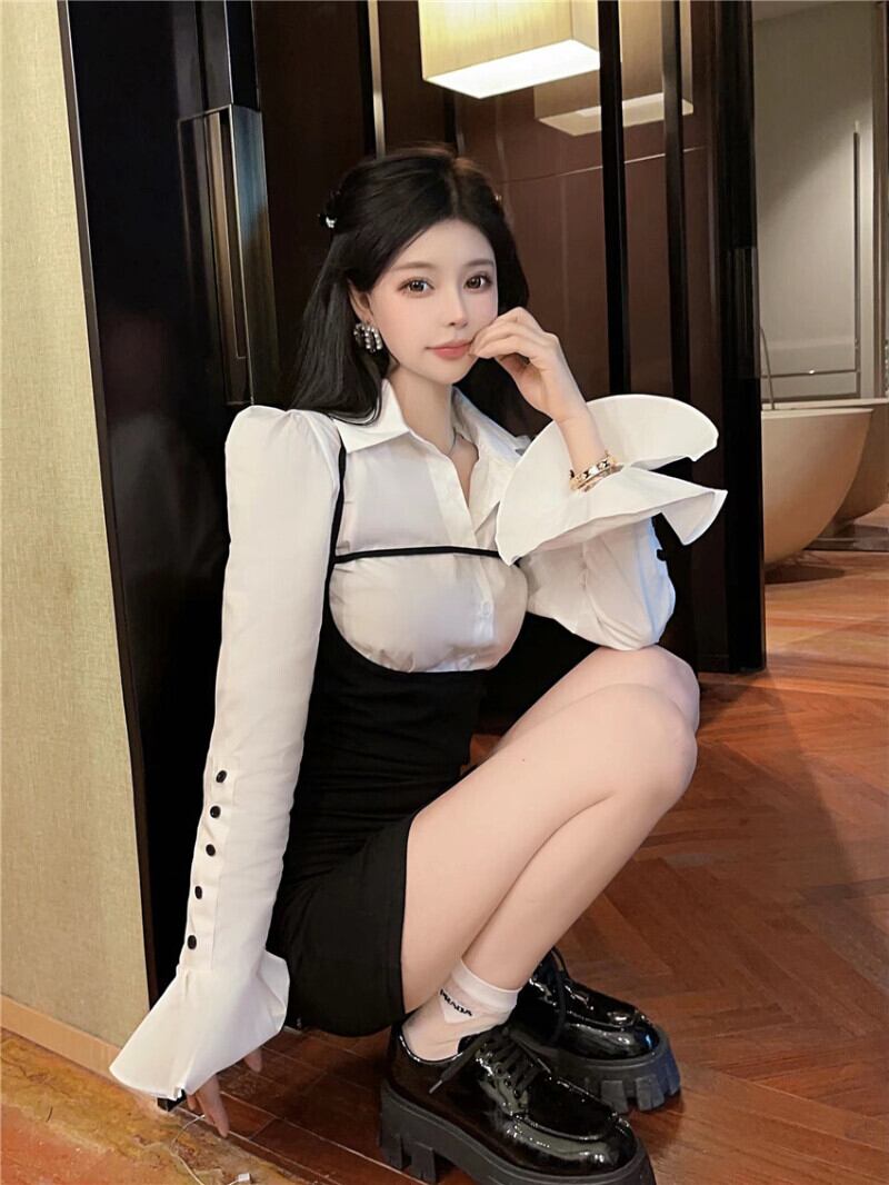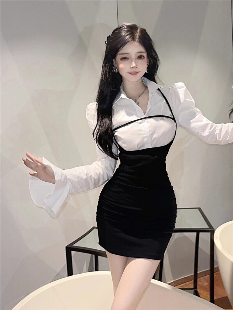 セクシーなサスペンダー黒ドレスミニワイルドスプリングパフスリーブ白シャツ 2 ピースセットレディブラウストップス Y2k シャツ ホワイト ブラック 春物