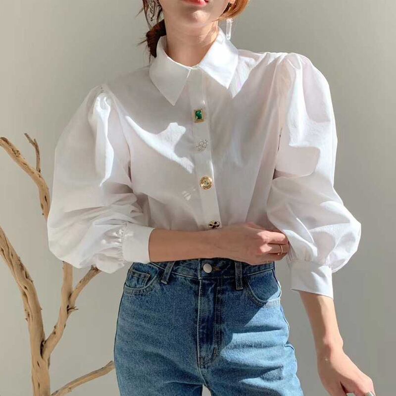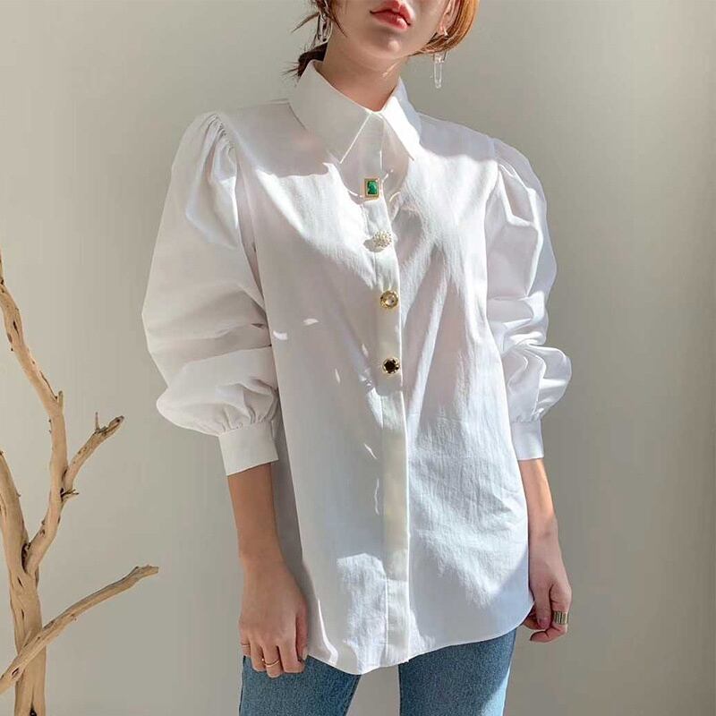 レディース シャツ 春 ゆったり 無地 ゆったり ランタン 袖 ボタン シャツ レディース ラペル トップス ホワイト ブラウス Blusa ランタンスリーブ スプリング 春物 ソリッドカラー