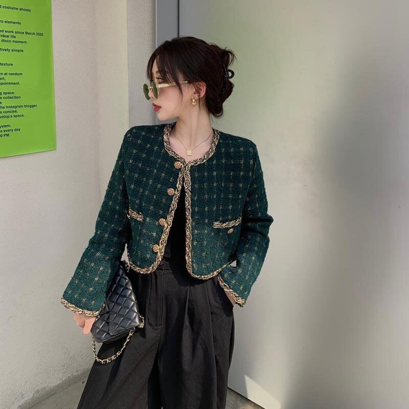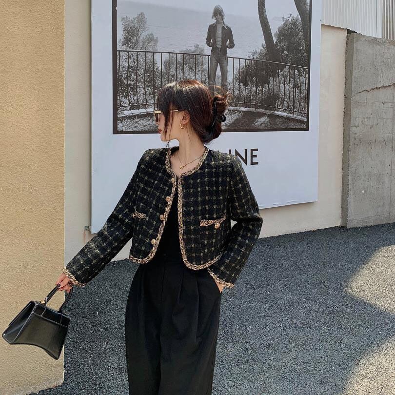 宮殿スタイル春スリム O ネック キルティング コート スリム ショート チェック柄ジャケットジャケット チャケータ シックなカーディガン レース スプリング 春物 Oネック