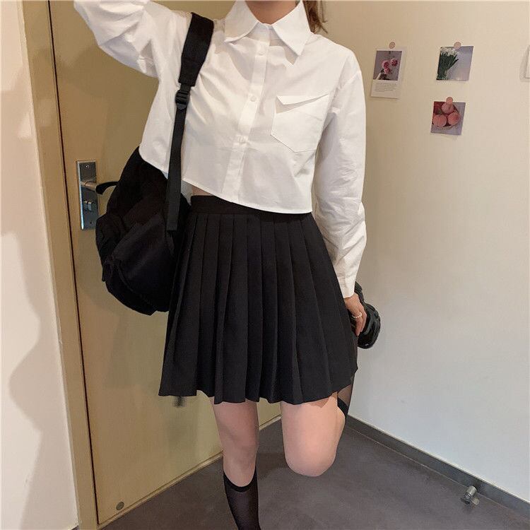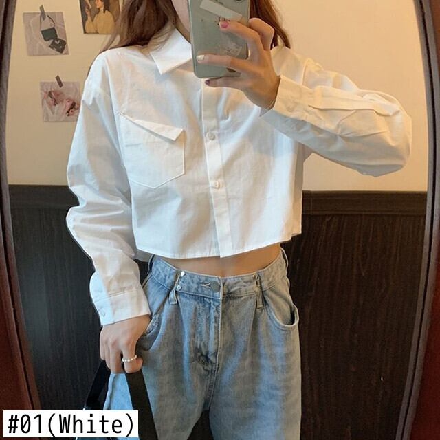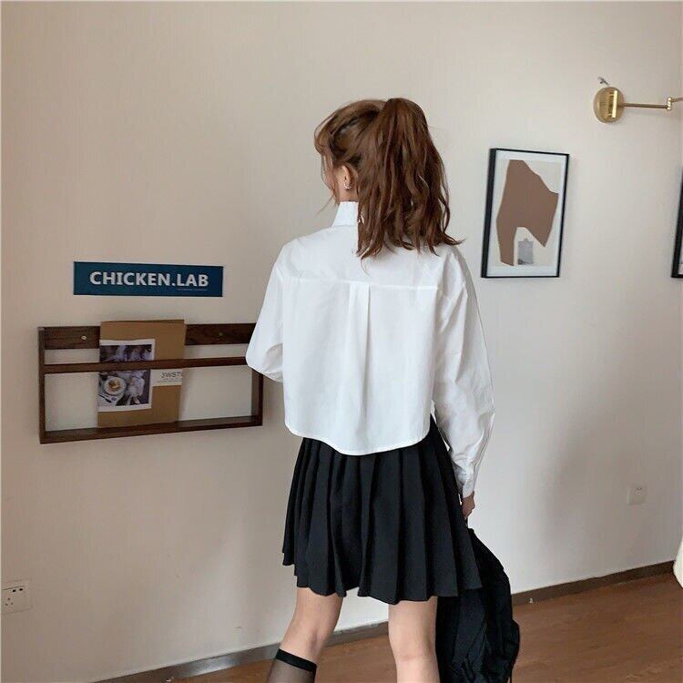 セクシーなスタイルプリーツクロップトップススリムホワイトシャツデモーダシャツ長袖ブラウスシンプル ロング