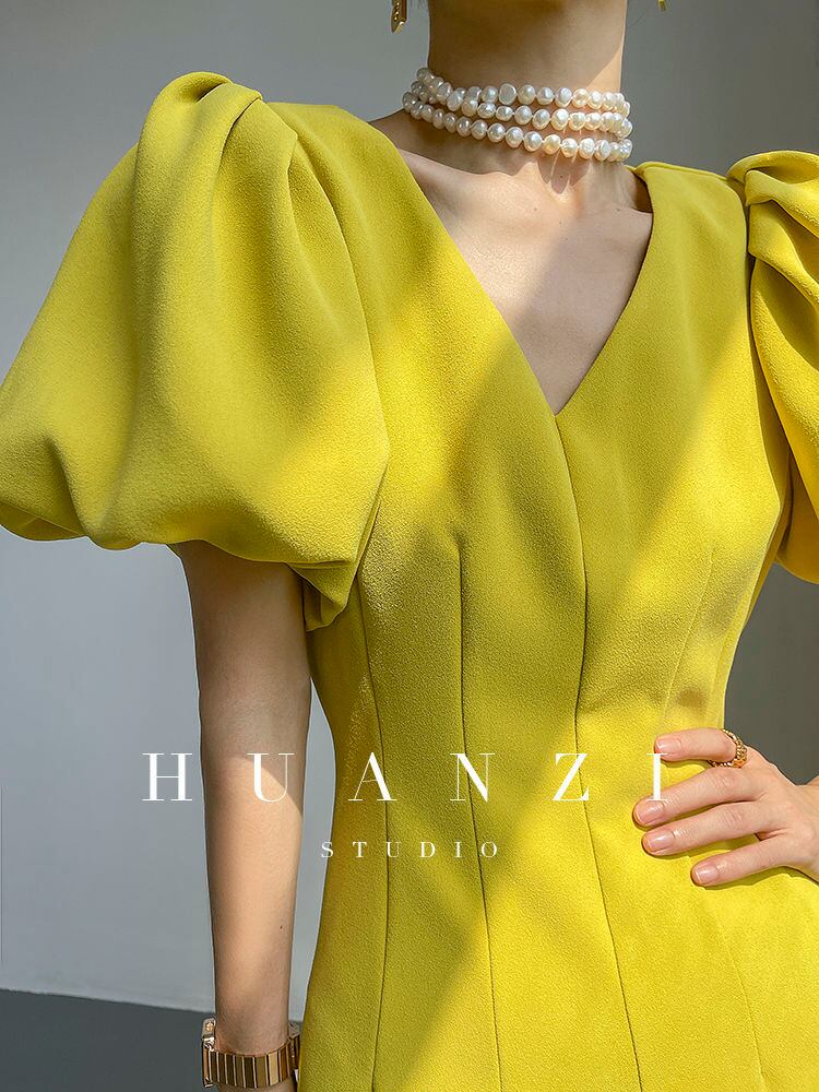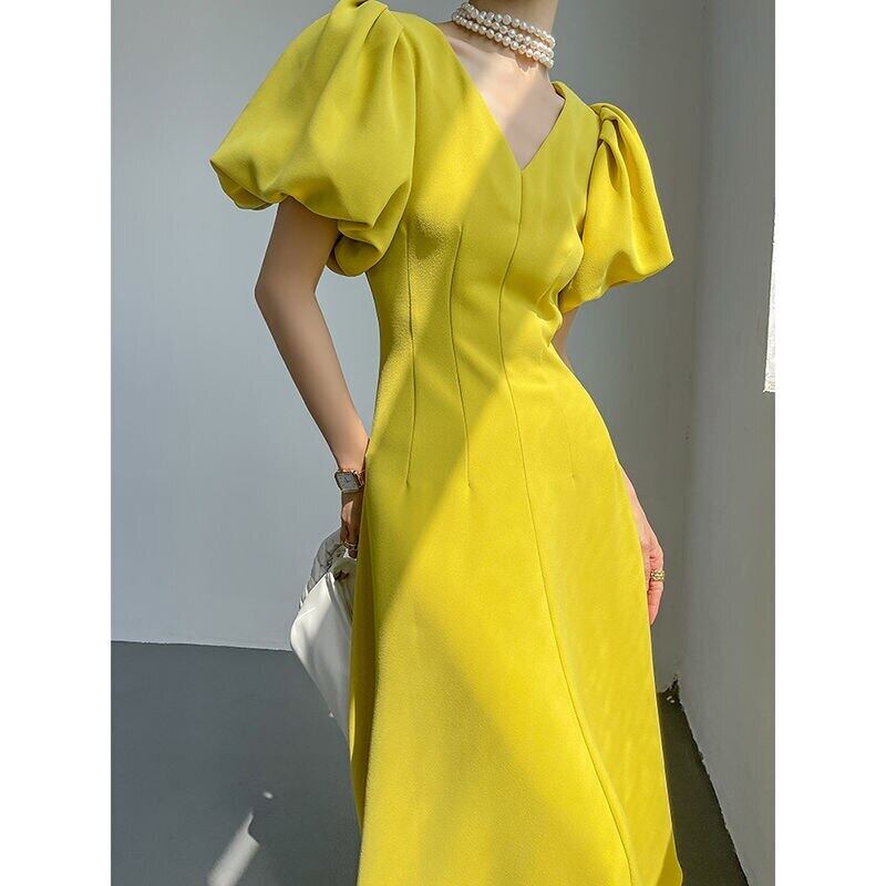 サマー V ボディコン イエロー ランタン ショート スリーブ ドレスパーティー Y2k Vestidos デ 半袖 ハーフスリーブ 夏物