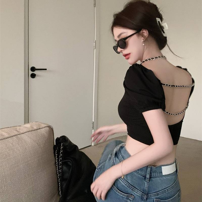 セクシーな背中 Tシャツスリムクロップトップスシックな黒半袖 Tシャツ V ネック不規則な Tシャツ Ropa ワイルド Tシャツホルター ショート ブラック ハーフスリーブ Vネック