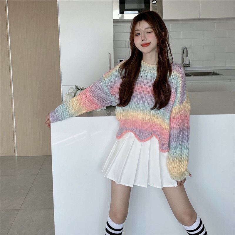 ジャンパー セーター O ネック クロップド グラデーション レインボー セーター レディース ニット セーター プルオーバー トップス Oネック
