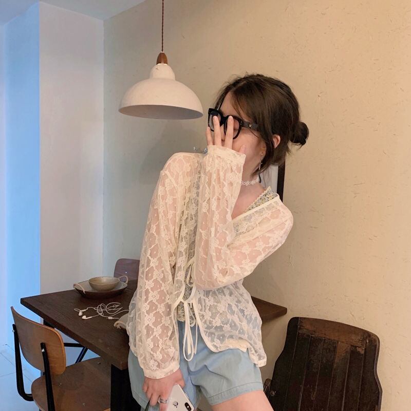 レースアップ長袖日焼け止めシャツトップ花柄キャミソールタンククロップトップス 2 セットブラウス透視カーディガン ロング 2セット