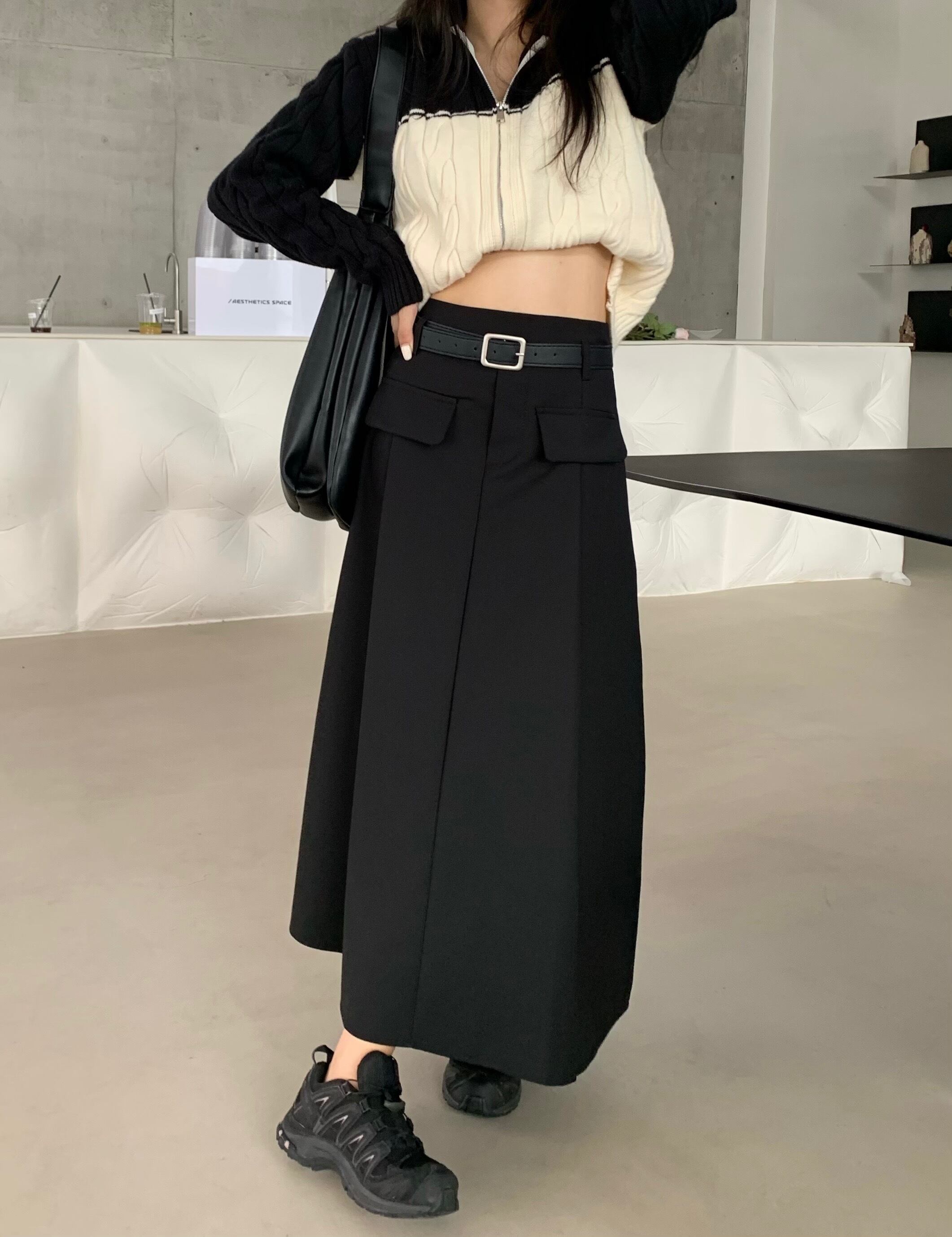 A ライングレープリーツスカート Y2k プレッピースタイルウエストミディラップヒップ黒スーツ段 Faldas Largas スカート ブラック