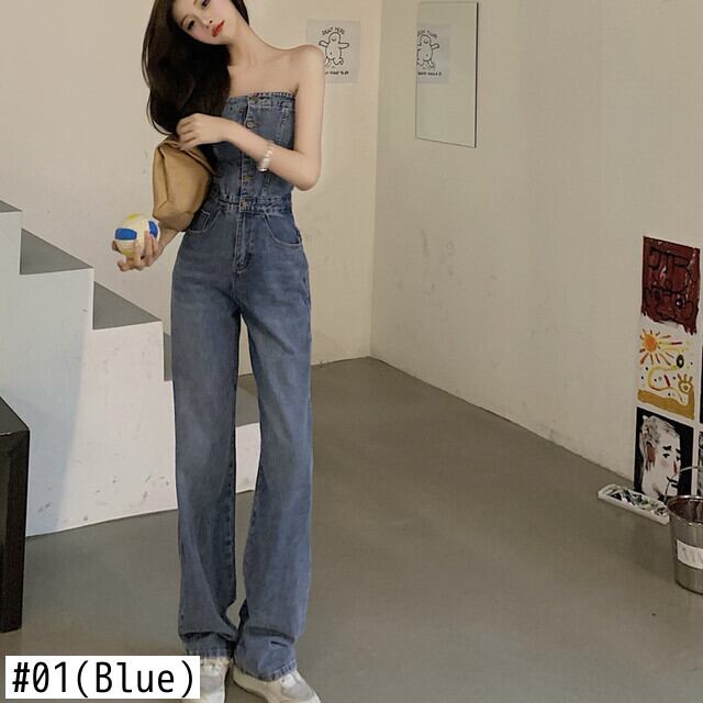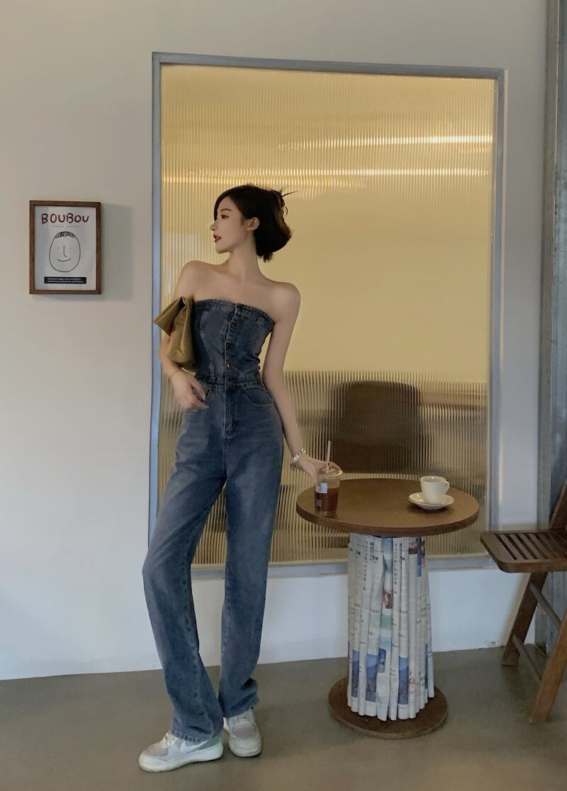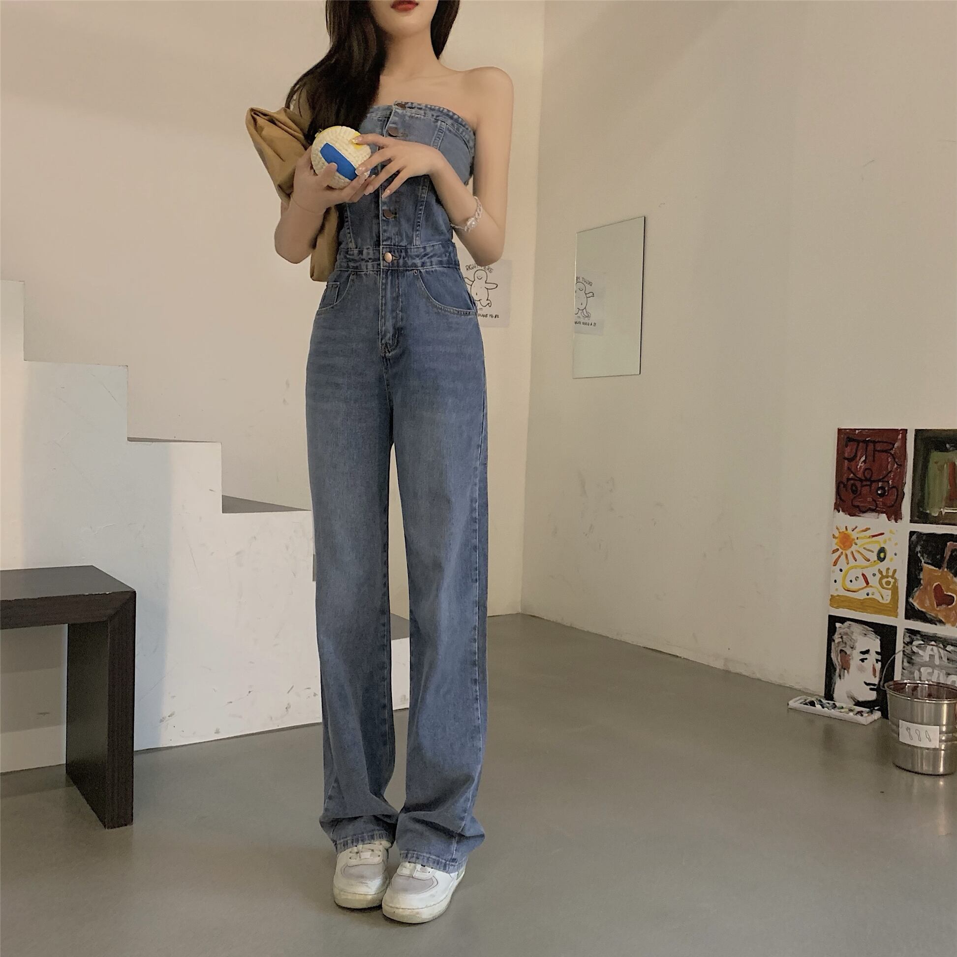 セクシーなストリートジャンプスーツの夏のレトロなウエストオープンバックノースリーブポケットデニムストレートワイドレッグパンツオーバーオールロンパース サマー 夏物 ワイドパンツ