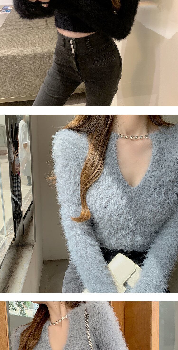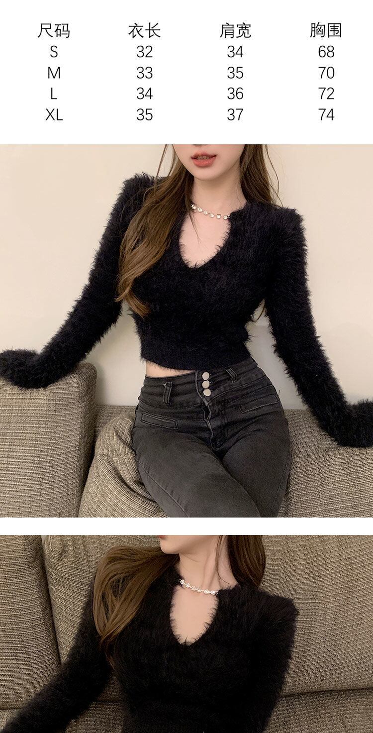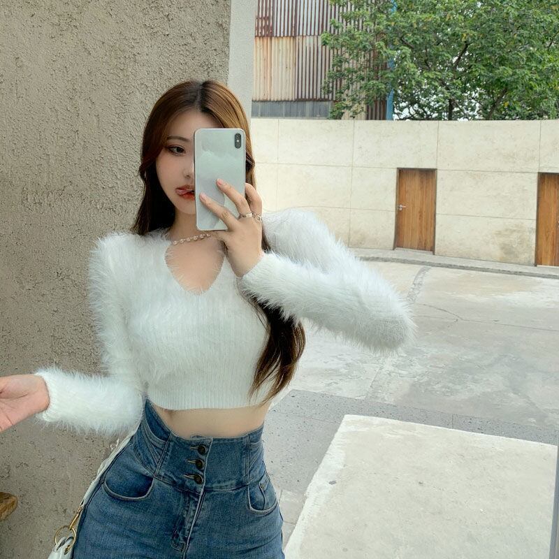 スリムセクシーなクロップトップスプルオーバー V チェーンセーター毛皮ニットシャツ長袖グレーモヘアセーターセーター Y2k ブラックホワイト ロング