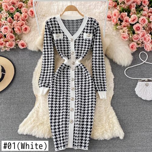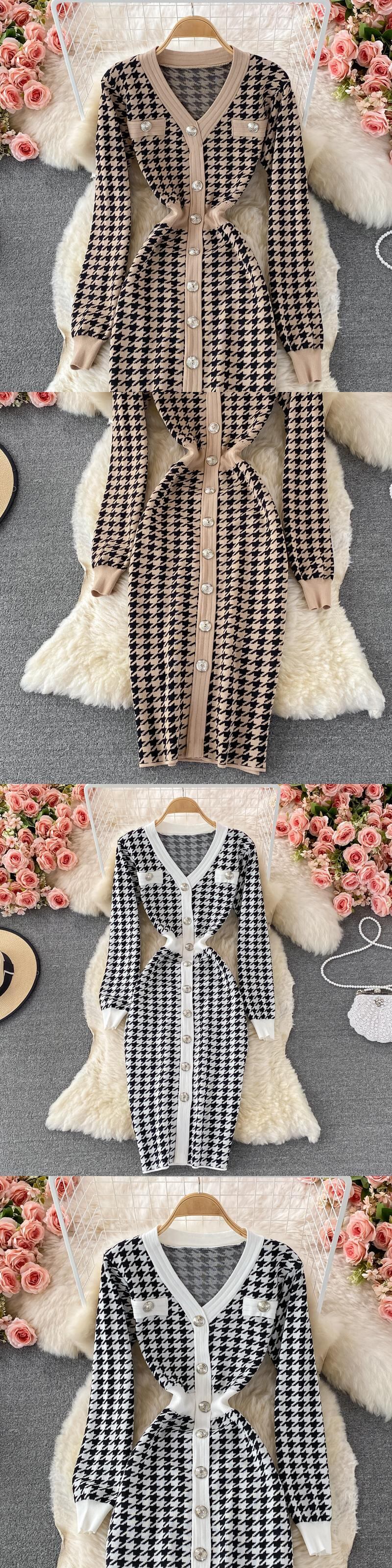 シングルブレスト V コントラスト千鳥格子ドレスチェック編みヒップ秋 Vestidos ボディコンセーター