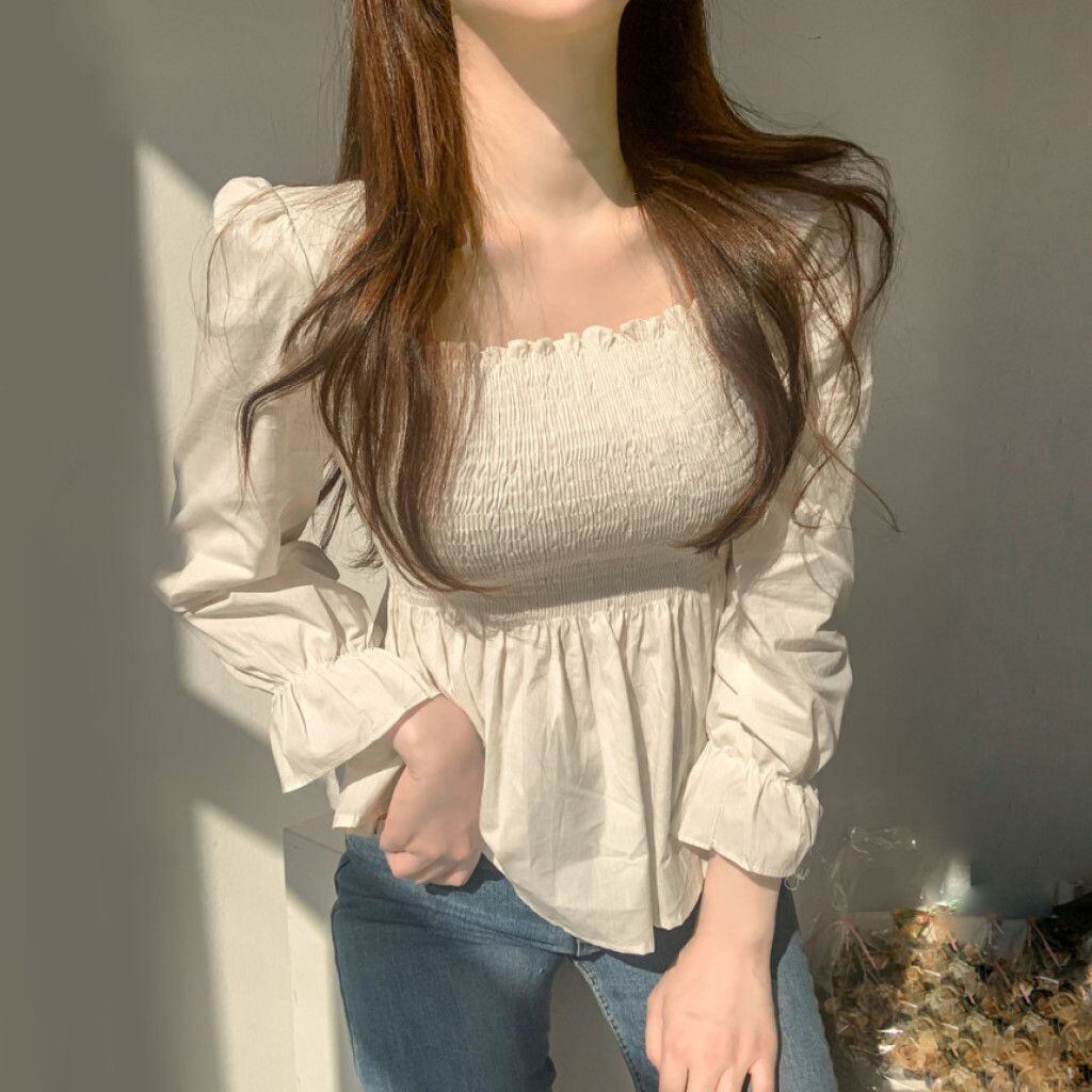 Blusa甘い正方形スリムプリーツ菌長袖シャツクロップトップブラウス白不規則なシャツ春 ロング ホワイト 大人ガーリー スウィート キュート カジュアル スプリング 春物 スクウェア