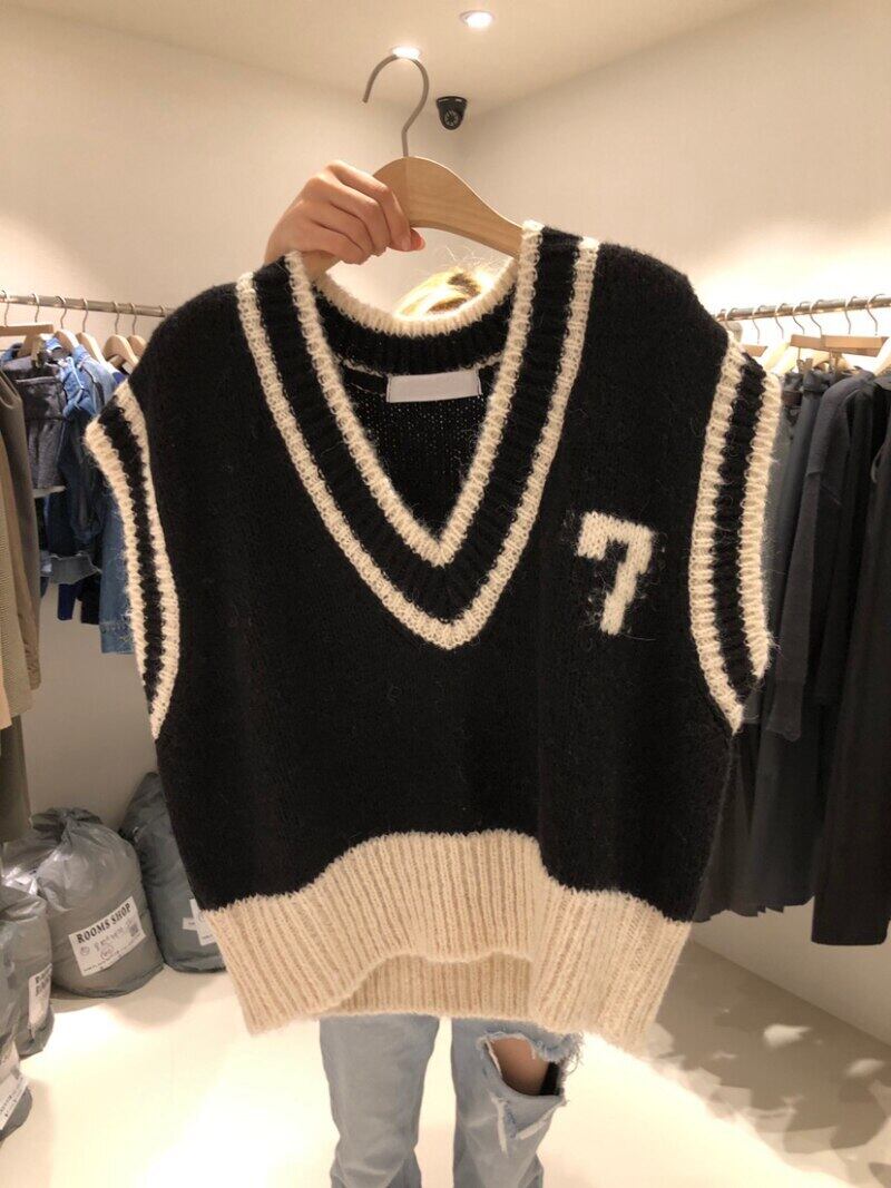 Chaleco コントラスト V ネック刺繍ノースリーブ ニット セーター ベスト トップス レトロ Y2k 黒ストライプ ベストプレッピー スタイル ブラック Vネック