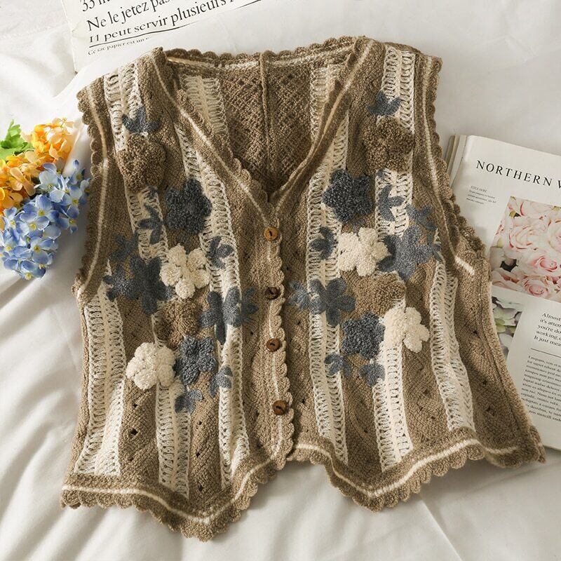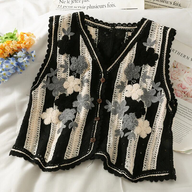 秋の Chaleco V ネック刺繍花柄セーター ベスト スリム中空アウト ノースリーブ 3D 花ニット トップ レッド オータム 秋物 Vネック フラワーデザイン