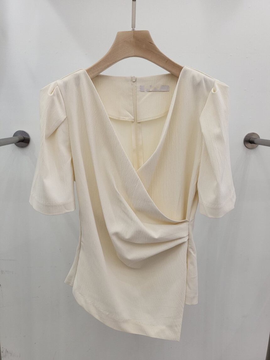 不規則なVネックスリム半袖シャツblusa気質OLトップススーツプリーツ夏ブラウスシャツ ショート ハーフスリーブ サマー 夏物