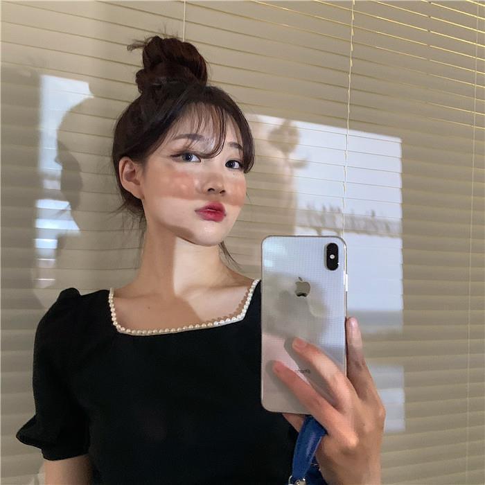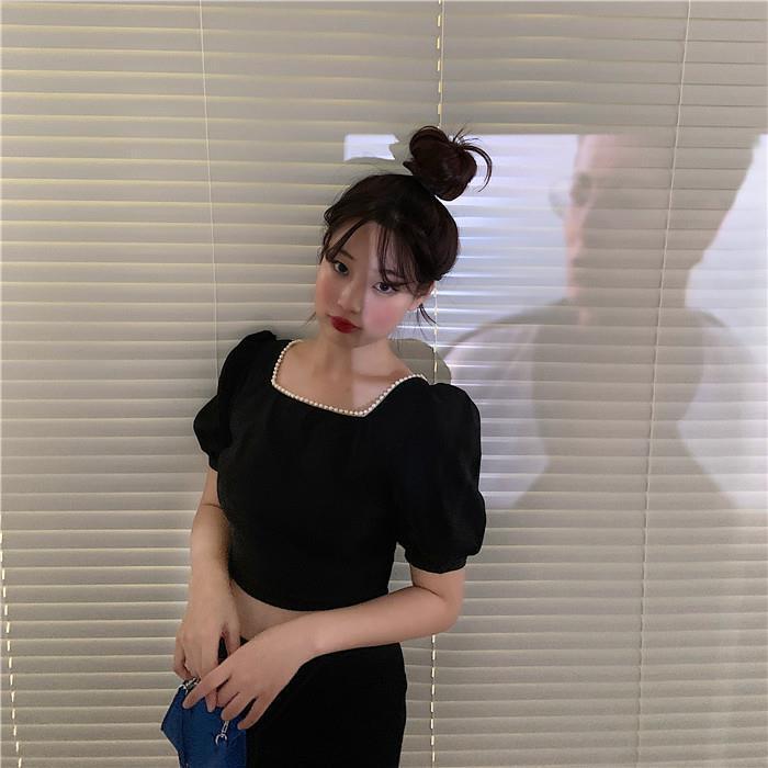 パールスクエアカラークロップトップススリムブラウス背中の開いたコートスタイル黒シャツ Blusa Tシャツレースアップ ブラック 真珠 スクウェア