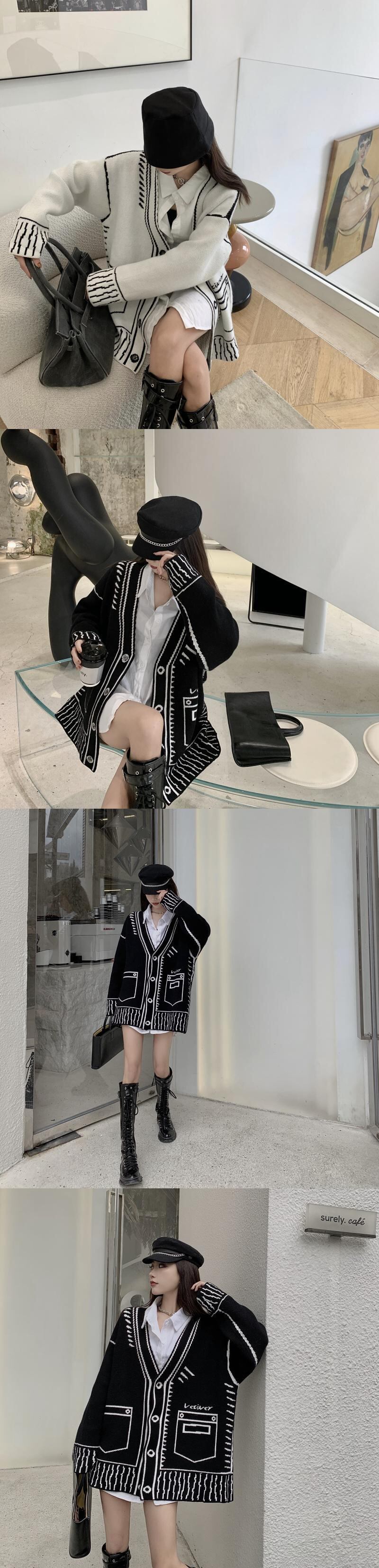 レトロな気質ルーズ V ネック落書きカーディガン ニット ジャケット ロング秋冬ニット セーター プル プル オータム 秋物 ウィンター 冬物 Vネック