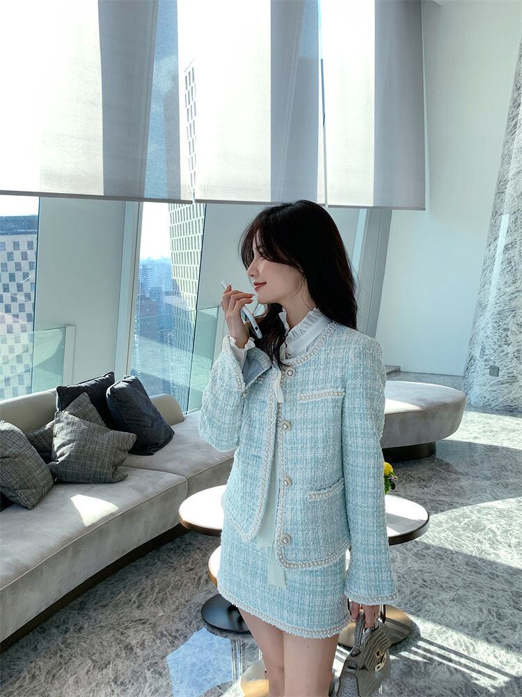 秋冬フルスリーブクルーツイードジャケットラップヒップミニチェック柄スカートセットツーピース衣装ウールコート オータム 秋物 ウィンター 冬物