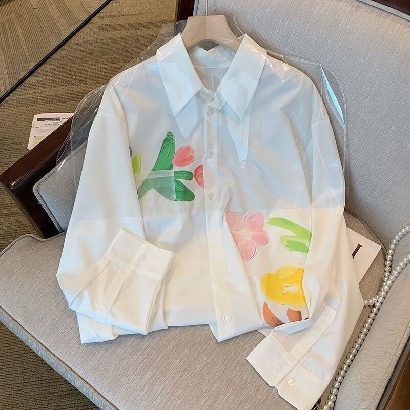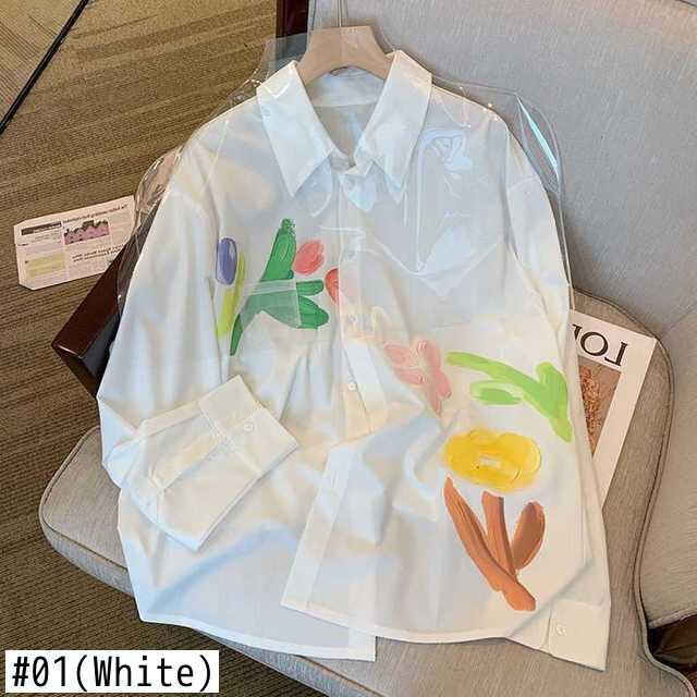 ルーズホワイトグラフィティシャツ長袖フラワーシャツカミーサ春トップスプリントブラウスシック ロング スプリング 春物 フラワーデザイン