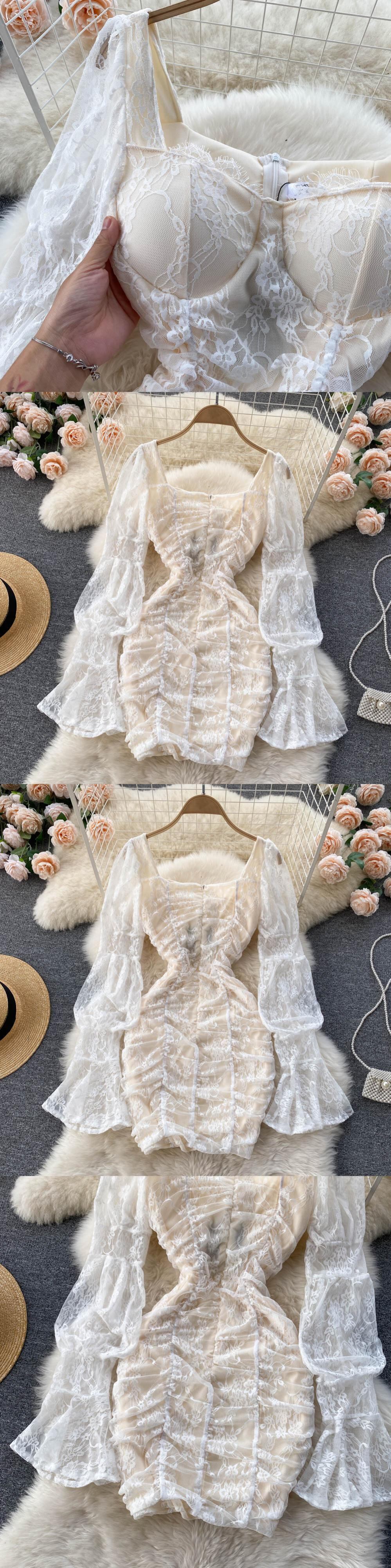 Vestidos Y2k セクシーなスクエアネックレース透視ランタンスリーブウエストラップヒップ黒ショートドレスプリーツドレスボディコン ブラック スクウェア