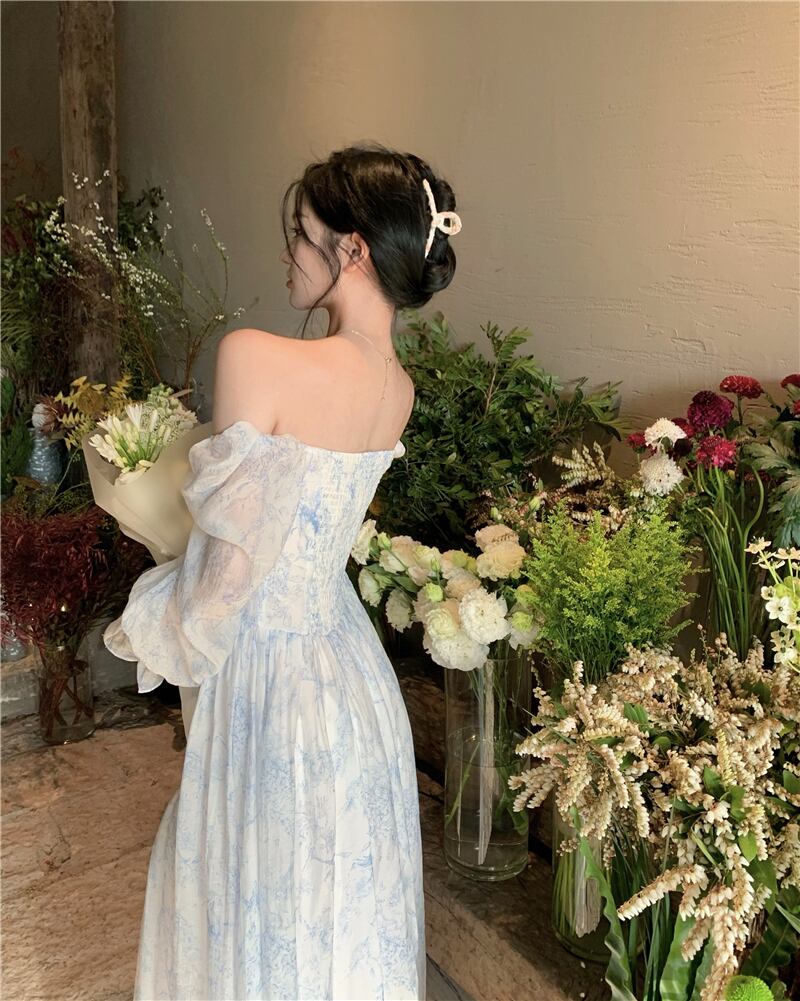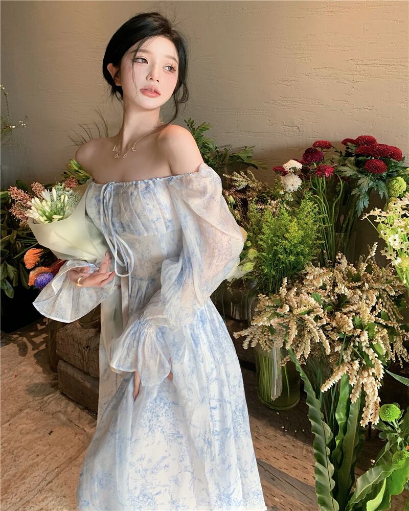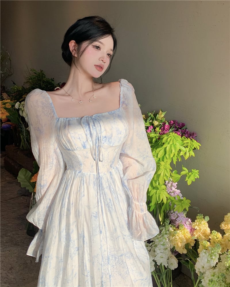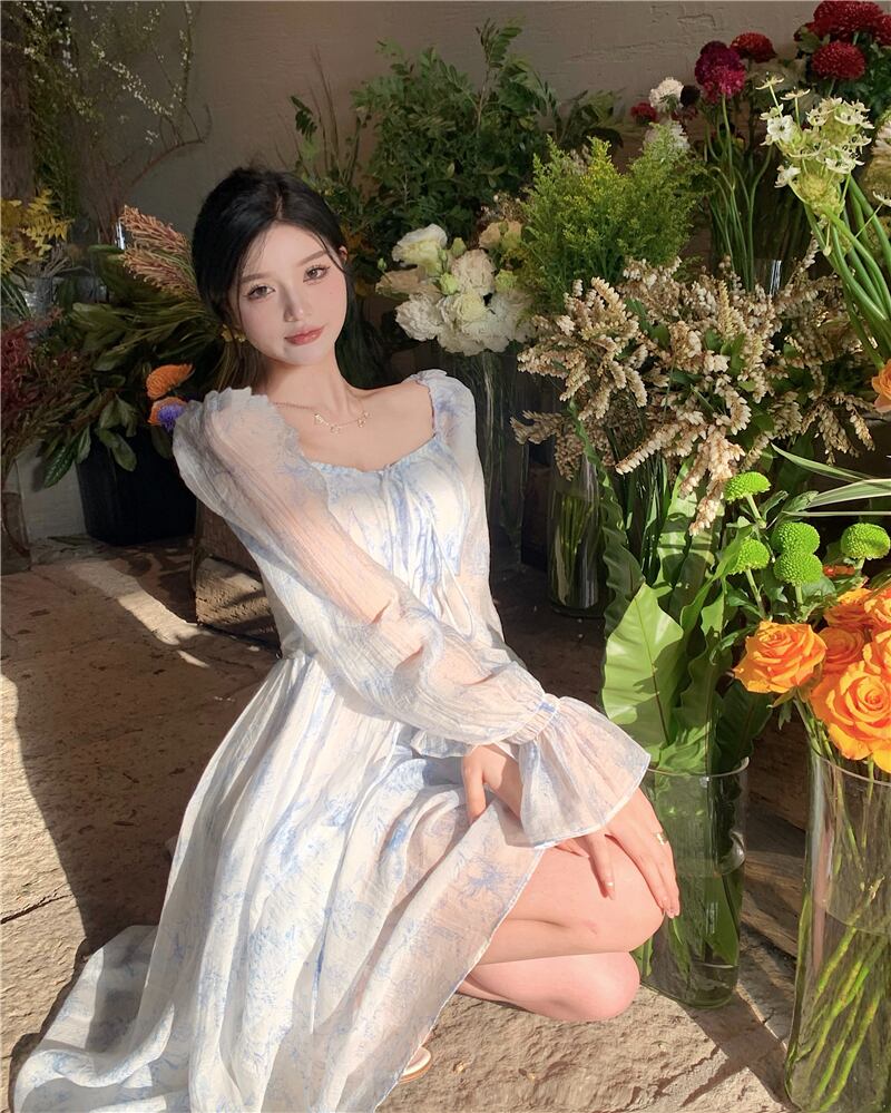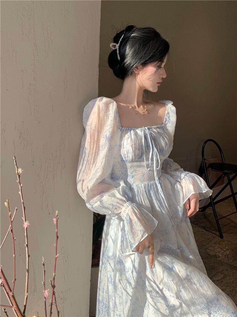 レースアップウエストスクエアカラー春花ドレス気質サマードレス A ライン Vestidos シフォン休日 スプリング 春物 夏物 花柄 Aライン スクウェア