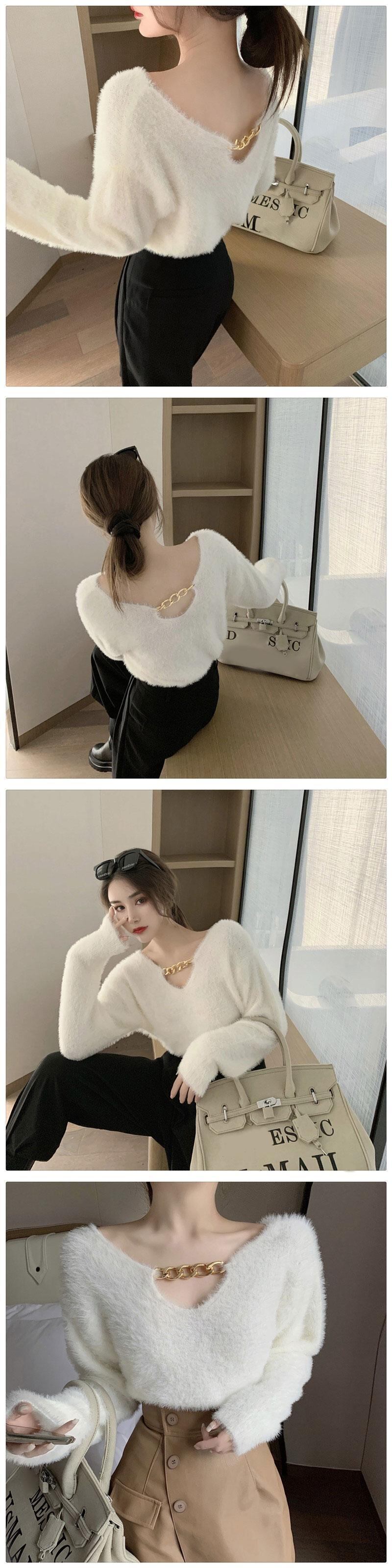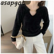 アサプゴット シック気質 チェーン ホワイト Vネック ニット 長袖 トップス 秋 ショート プルオーバー Tシャツ ブラック ルーズ ワイルド ロング オータム 秋物