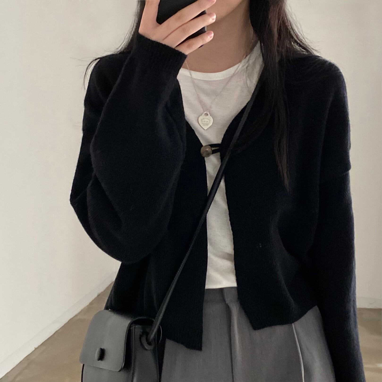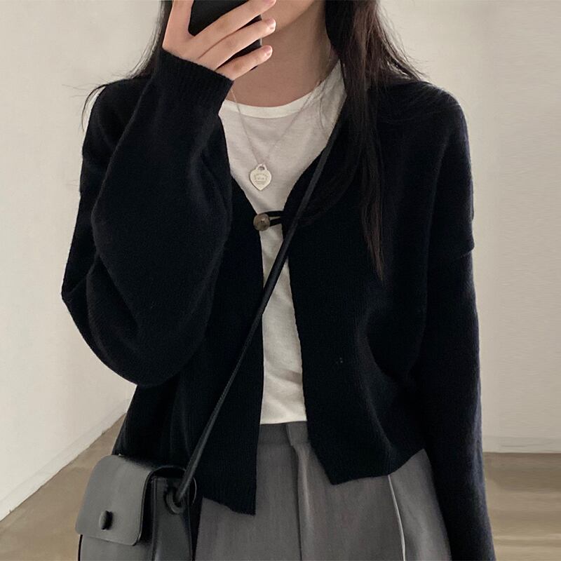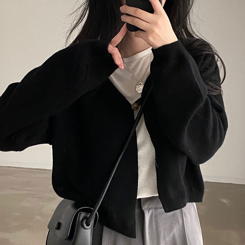 ワンボタンセーターレイジーレトロVネックルーズ無地長袖ニットカーディガンブラッククロップトップスY2kセーター ロング ソリッドカラー