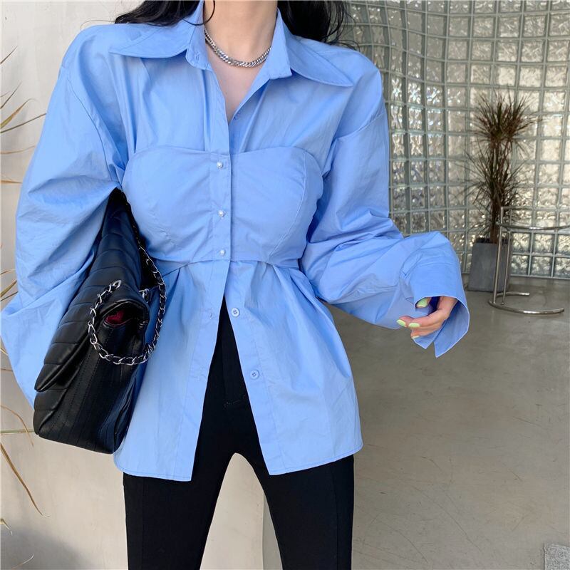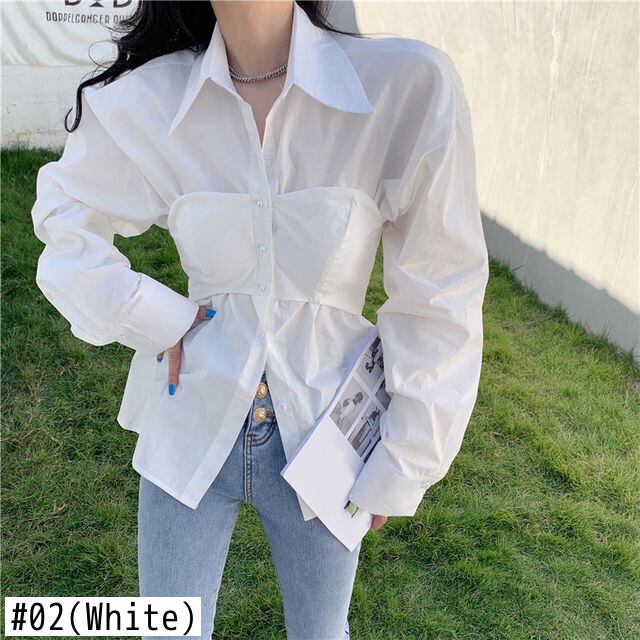 シックなフェイク 2 コルセット トップス春ブルー ブラウス カミーサ s ホワイト シャツワイルド オフィス レディ スプリング 春物 会社 学校 通勤や通学にも