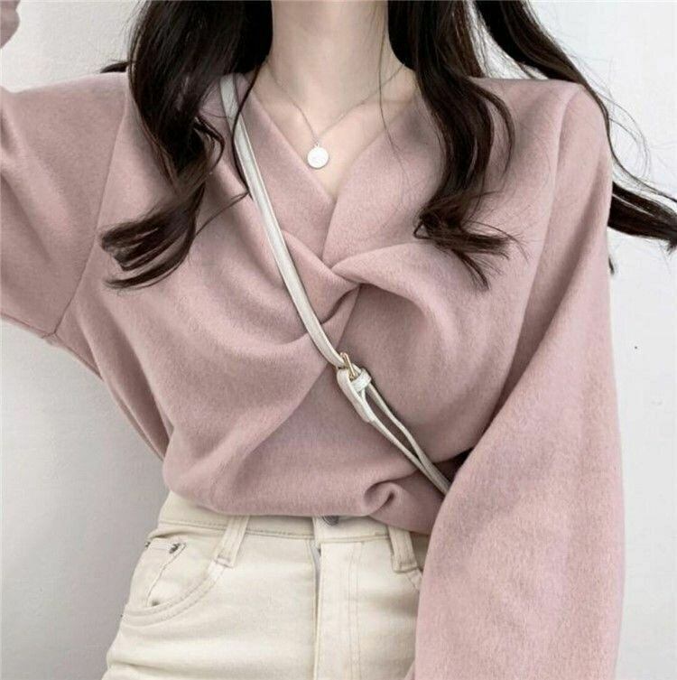 基本的なワイルド V ネックグレーフリース Tシャツ秋冬シャツスリム Ropa デ特大ピンク Tシャツソリッドトップス オータム 秋物 ウィンター 冬物 Vネック ソリッドカラー