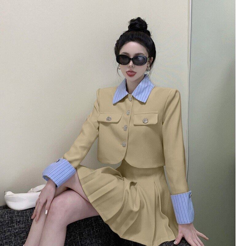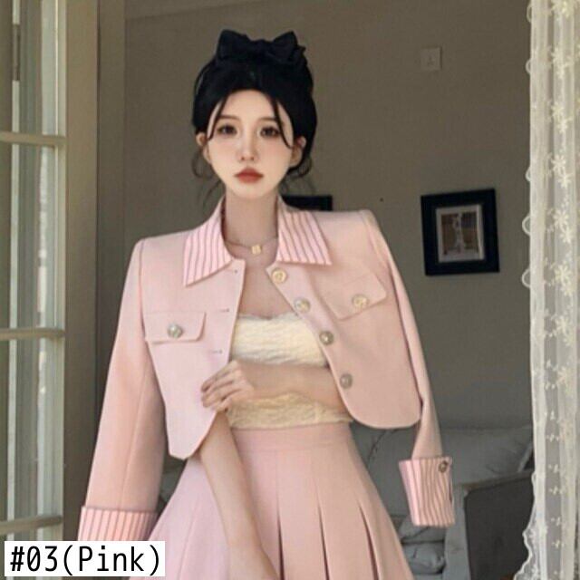 ストライプ ブレザー Femenino コントラスト パッチワーク スーツ コート ウエスト プリーツ スカート 2 点セット春 スプリング 春物
