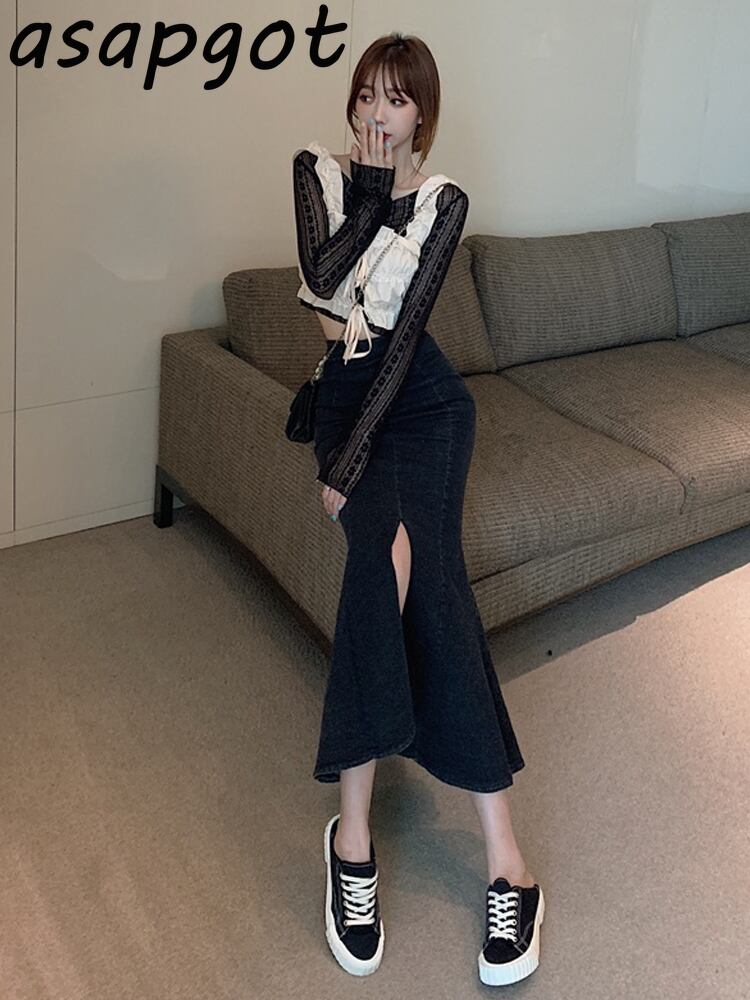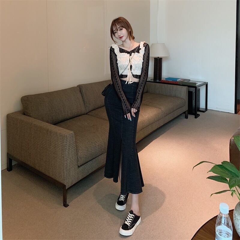 スリムウエストスプリットマーメイドスカートミッドレングスバッグヒップデニムスカート段 Faldas 秋 オータム 秋物