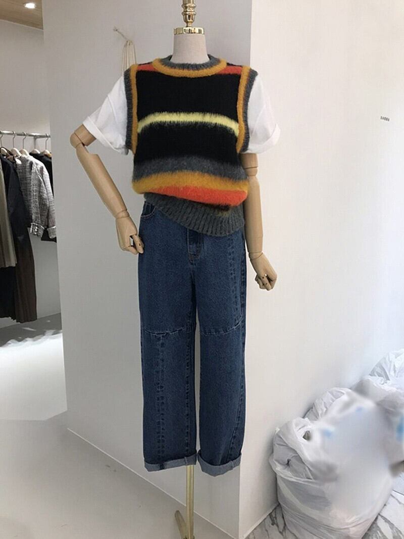 Chaleco 秋 コントラストカラー Oネック ストライプ ニットベスト ノースリーブ セーターベスト トップス レトロプル Y2k セーターベスト オータム 秋物