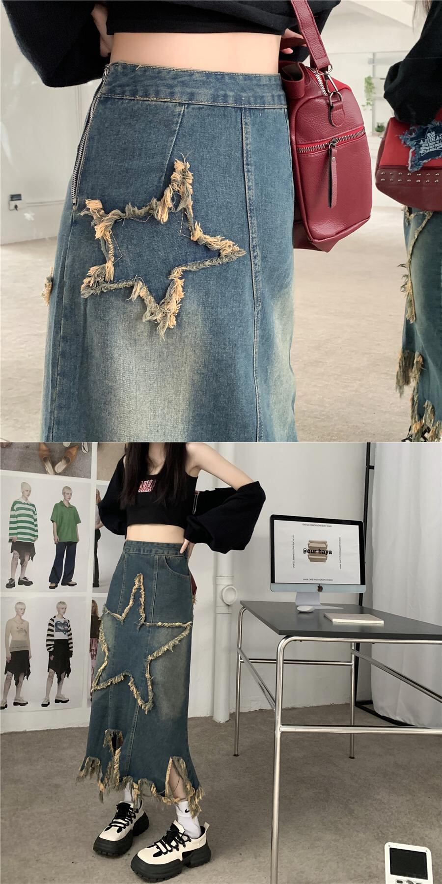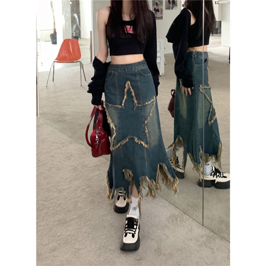 ロングラップヒップスリムウエストパッチワークスタージーンズスカート Y2k ファルダモーダアメリカンデニムスカート スリムヒップ