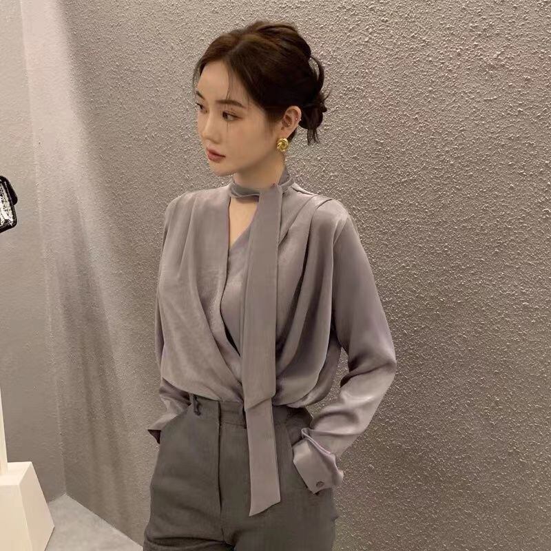 レースアップ Vネック サテンシャツ ブルーサ 長袖 リボン トップス OL スリム ワイルドデブラウス ロング