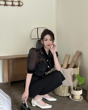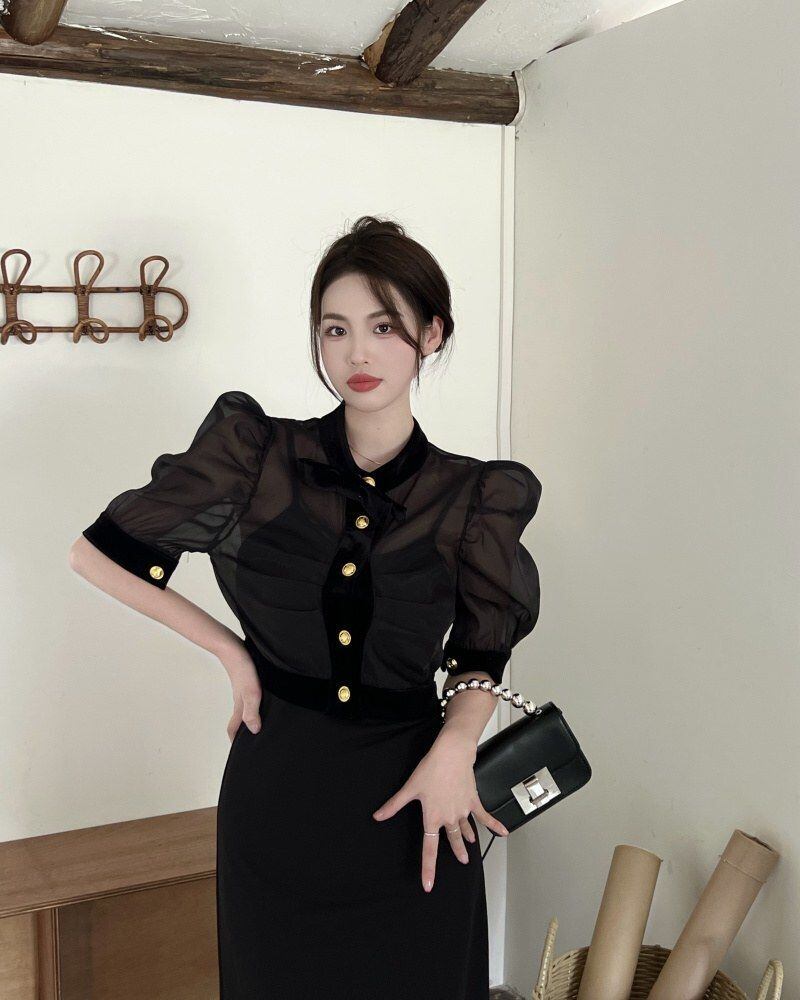 パフ半袖黒シフォンシャツ弓スリムクロップトップス春メッシュシャツセクシーなストラップドレスボディコンセット ショート ブラック リボン ハーフスリーブ スプリング 春物