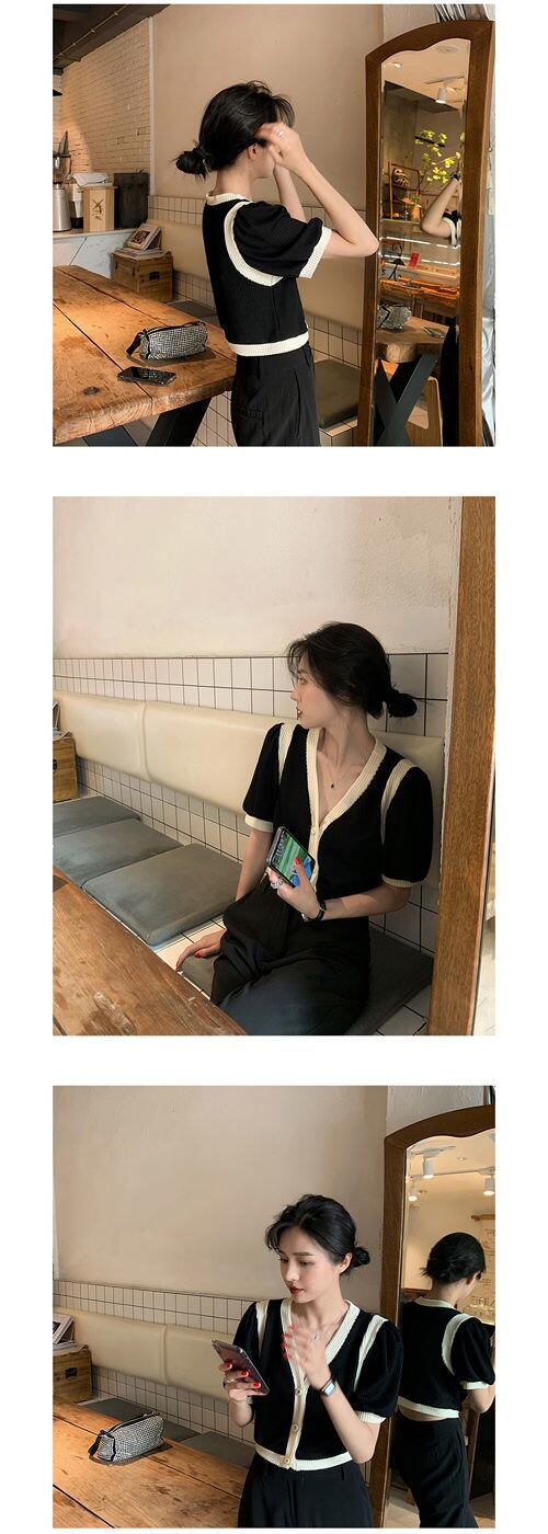 Vネックパフ 半袖 カーディガン ブラック セーター スリム クロップ カーディガン ニット シャツ ジャケット プル セーター ショート ハーフスリーブ