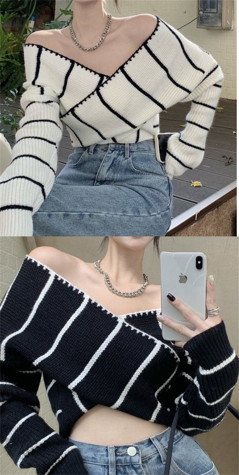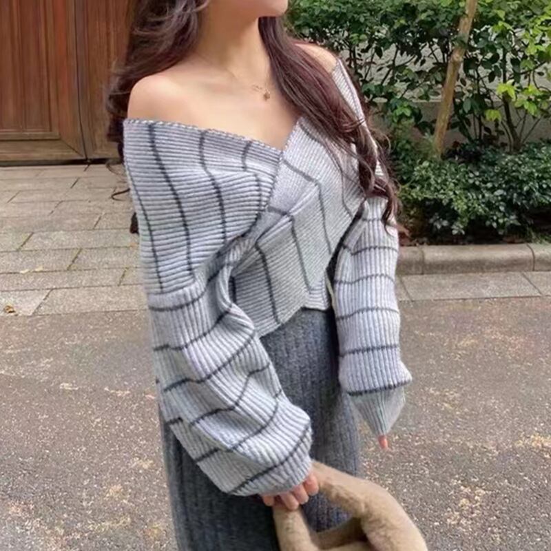クロス V ネック オフショルダー ブラック ホワイト ストライプ ニット セーター セクシー ワン スリム イレギュラー クロップ トップ グレー Vネック