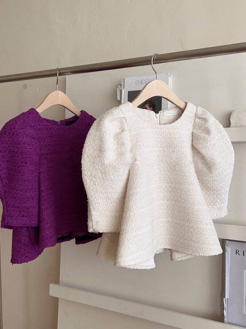 気質ジッパーラウンドパフスリーブトップクロップツイードシャツデモーダ秋ブラウス