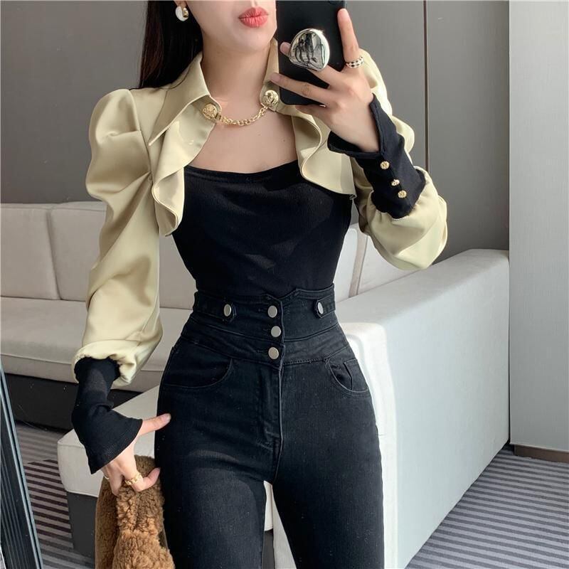 レディース シャツ スリム セクシー シック パフ 長袖 ブラック ベルベット シャツ 春 ブラウス カミーサ トップス ロング スプリング 春物