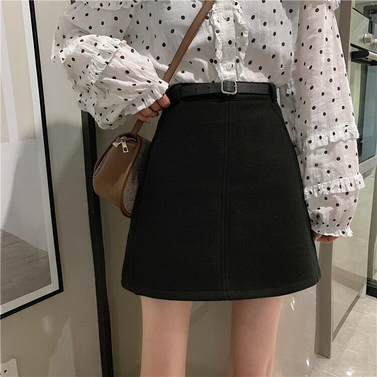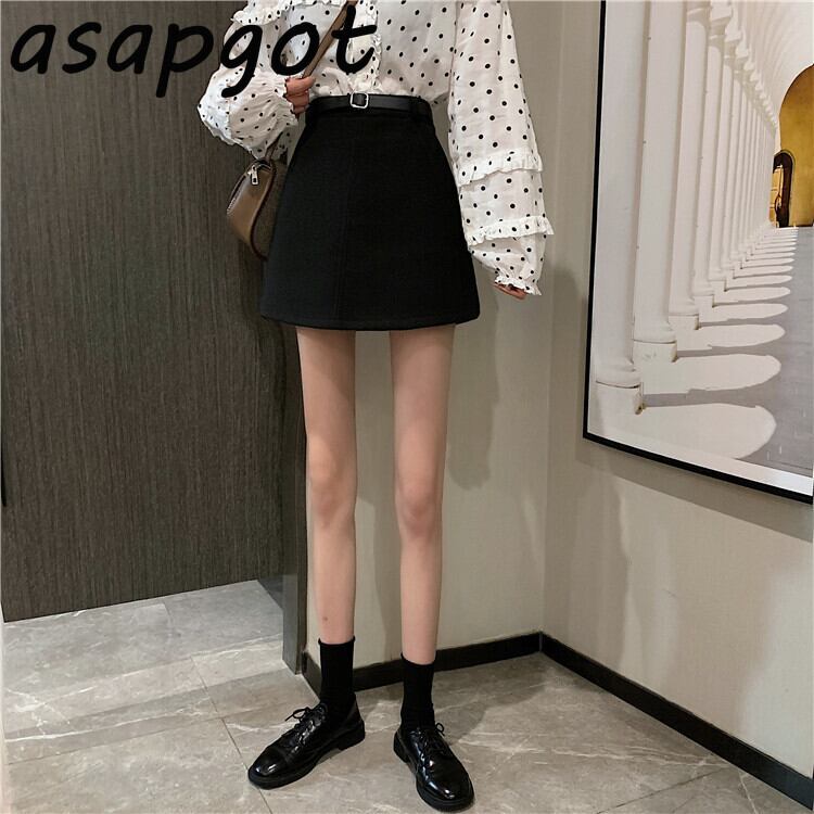 Asapgot シックな気質優しいベージュのウールのスカートのの冬のウエストスリム A ライン黒段 Faldas ワイルド OL 膝 ブラック ウィンター 冬物 Aライン