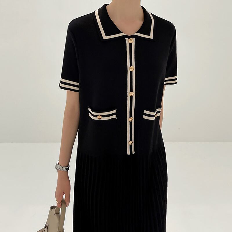 マキシラペルコントラストメタルシングルブレスト黒半袖ニットドレスローブ Vestidos ストライプ ショート ブラック ハーフスリーブ