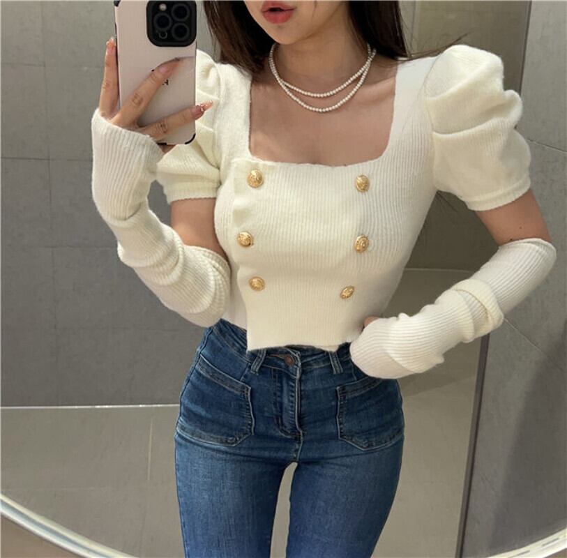 セクシーなスクエアカラークロップトップダブルブレストセーターワイルドスリム無地クロップドピンクカーディガンニットコートシャツ ソリッドカラー スクウェア