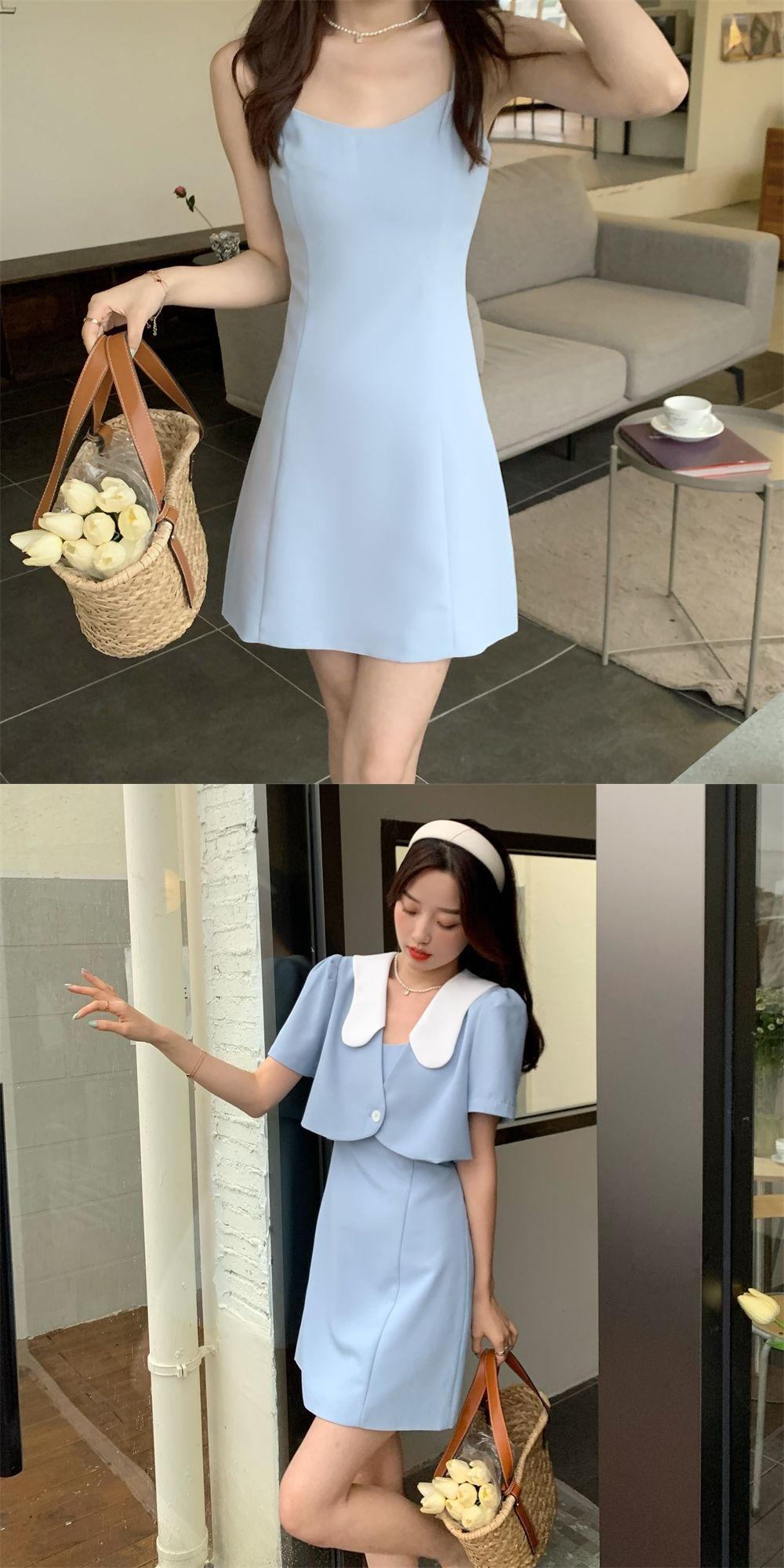 Vネック半袖シングルボタンシャツクロップブレザースーツカーディガンミニスパゲッティストラップドレスセットジャケットスウィートスリム ショート ハーフスリーブ 大人ガーリー キュート カジュアル